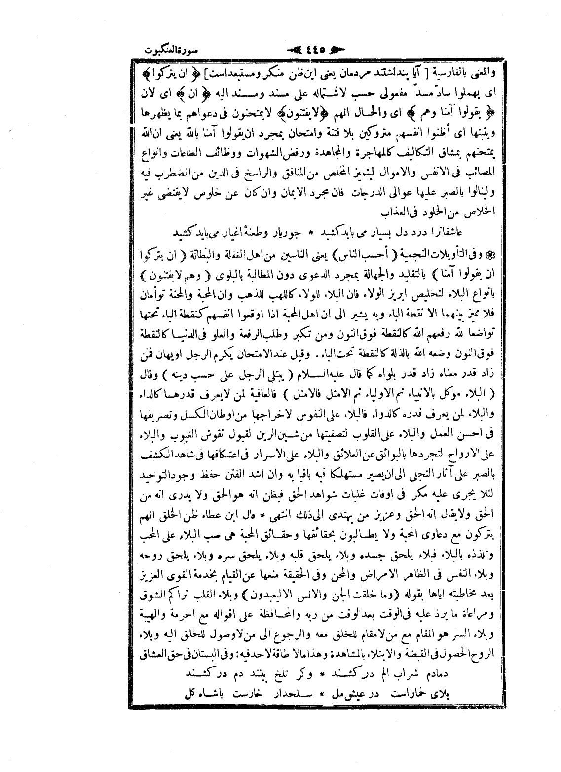 وفى التأويلات النجمية (أَحَسِبَ النَّاسُ) يعنى الناسين من اهل الغفلة والبطالة (أَنْ يُتْرَكُوا أَنْ يَقُولُوا آمَنَّا) بالتقليد والجهالة بمجرد الدعوى دون المطالبة بالبلوى (وَهُمْ لا يُفْتَنُونَ) بانواع البلاء لتخليص إبريز الولاء فان البلاء للولاء كاللهب للذهب وان المحبة والمحنة توأمان فلا مميز بينهما الا نقطة الباء وبه يشير الى ان اهل المحبة إذا أوقعوا أنفسهم كنقطة الباء تحتها تواضعا لله رفعهم الله كالنقطة فوق النون ومن تكبر وطلب الرفعة والعلو فى الدنيا كالنقطة فوق النون وضعه الله بالذلة كالنقطة تحت الباء. وقيل عند الامتحان يكرم الرجل او يهان فمن زاد قدر معناه زاد قدر بلواه كما قال عليه السلام (يبتلى الرجل على حسب دينه) وقال (البلاء موكل بالأنبياء ثم الأولياء ثم الأمثل فالامثل) فالعافية لمن لا يعرف قدرها كالداء والبلاء لمن يعرف قدره كالدواء فالبلاء على النفوس لاخراجها من أوطان الكسل وتصريفها فى احسن العمل والبلاء على القلوب لتصفيتها من شين الرين لقبول نقوش الغيوب والبلاء على الأرواح لتجردها بالبوائق عن العلائق والبلاء على الاسرار فى اعتكافها فى شاهد الكشف بالصبر على آثار التجلي الى ان يصير مستهلكا فيه باقيا به وان أشد الفتن حفظ وجود التوحيد لئلا يجرى عليه مكر فى اوقات غلبات شواهد الحق فيظن انه هو الحق ولا يدرى انه من الحق ولا يقال انه الحق وعزيز من يهتدى الى ذلك انتهى قال ابن عطاء ظن الخلق انهم يتركون مع دعاوى المحبة ولا يطالبون بحقائقها وحقائق المحبة هى صب البلاء على المحب وتلذذه بالبلاء فبلاء يلحق جسده وبلاء يلحق قلبه وبلاء يلحق سره وبلاء يلحق روحه وبلاء النفس فى الظاهر الأمراض والمحن وفى الحقيقة منعها عن القيام بخدمة القوى العزيز بعد مخاطبته إياها بقوله (وَما خَلَقْتُ الْجِنَّ وَالْإِنْسَ إِلَّا لِيَعْبُدُونِ) وبلاء القلب تراكم الشوق ومراعاة ما يرد عليه فى الوقت بعد الوقت من ربه والمحافظة على أقواله مع الحرمة والهيبة وبلاء السر هو المقام مع من لا مقام للخلق معه والرجوع الى من لا وصول للخلق اليه وبلاء الروح الحصول فى القبضة والابتلاء بالمشاهدة وهذا ما لا طاقة لاحد فيه