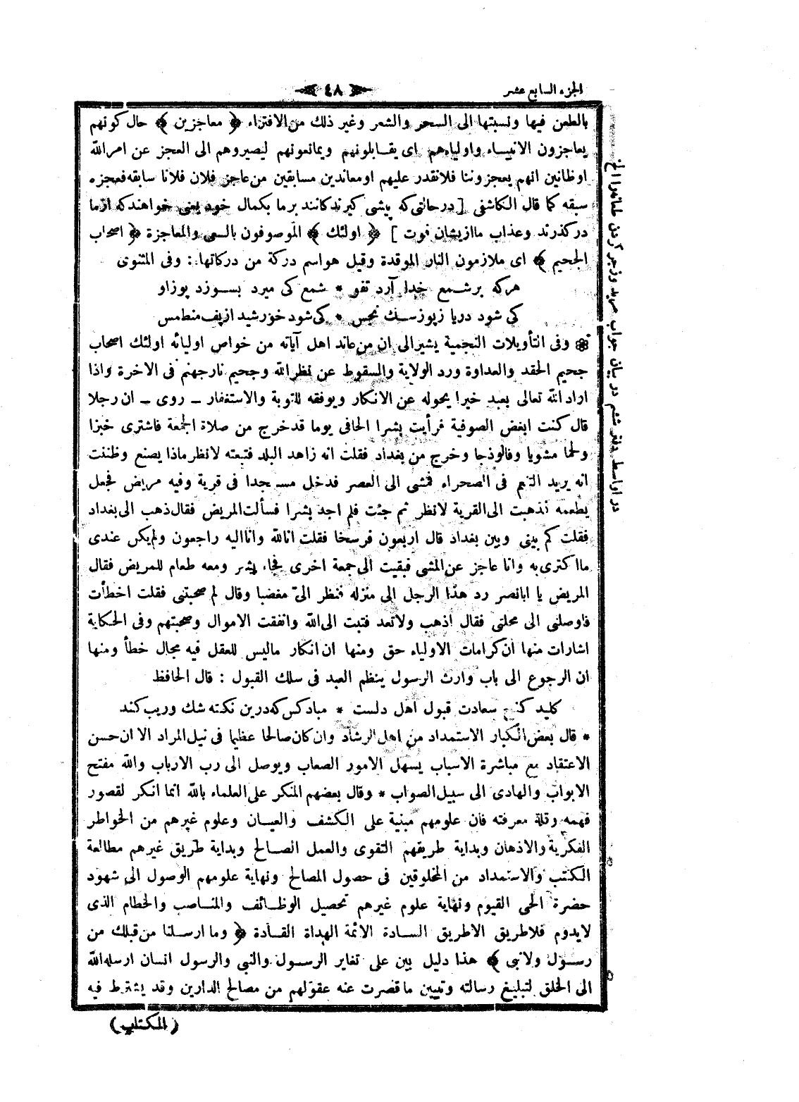 قال بعض الكبار الاستمداد من اهل الرشاد وان كان صالحا عظيما فى نيل المراد الا ان حسن الاعتقاد مع مباشرة الأسباب يسهل الأمور الصعاب ويوصل الى رب الأرباب والله مفتح الأبواب والهادي الى سبيل الصواب وقال بعضهم المنكر على العلماء بالله انما أنكر لقصور فهمه وقلة معرفته فان علومهم مبنية على الكشف والعيان وعلوم غيرهم من الخواطر الفكرية والأذهان وبداية طريقهم التقوى والعمل الصالح وبداية طريق غيرهم مطالعة الكتب والاستمداد من المخلوقين فى حصول المصالح ونهاية علومهم الوصول الى شهود حضرة الحي القيوم ونهاية علوم غيرهم نحصيل الوظائف والمناصب والخطام الذي لا يدوم فلا طريق إلا طريق السادة الائمة الهداة القادة وَما أَرْسَلْنا مِنْ قَبْلِكَ مِنْ رَسُولٍ وَلا نَبِيٍّ هذا دليل بين على تغاير الرسول والنبي والرسول انسان أرسله الله الى الخلق لتبليغ رسالته وتبيين ما قصرت عنه عقولهم من مصالح الدارين وقد يشترط فيه