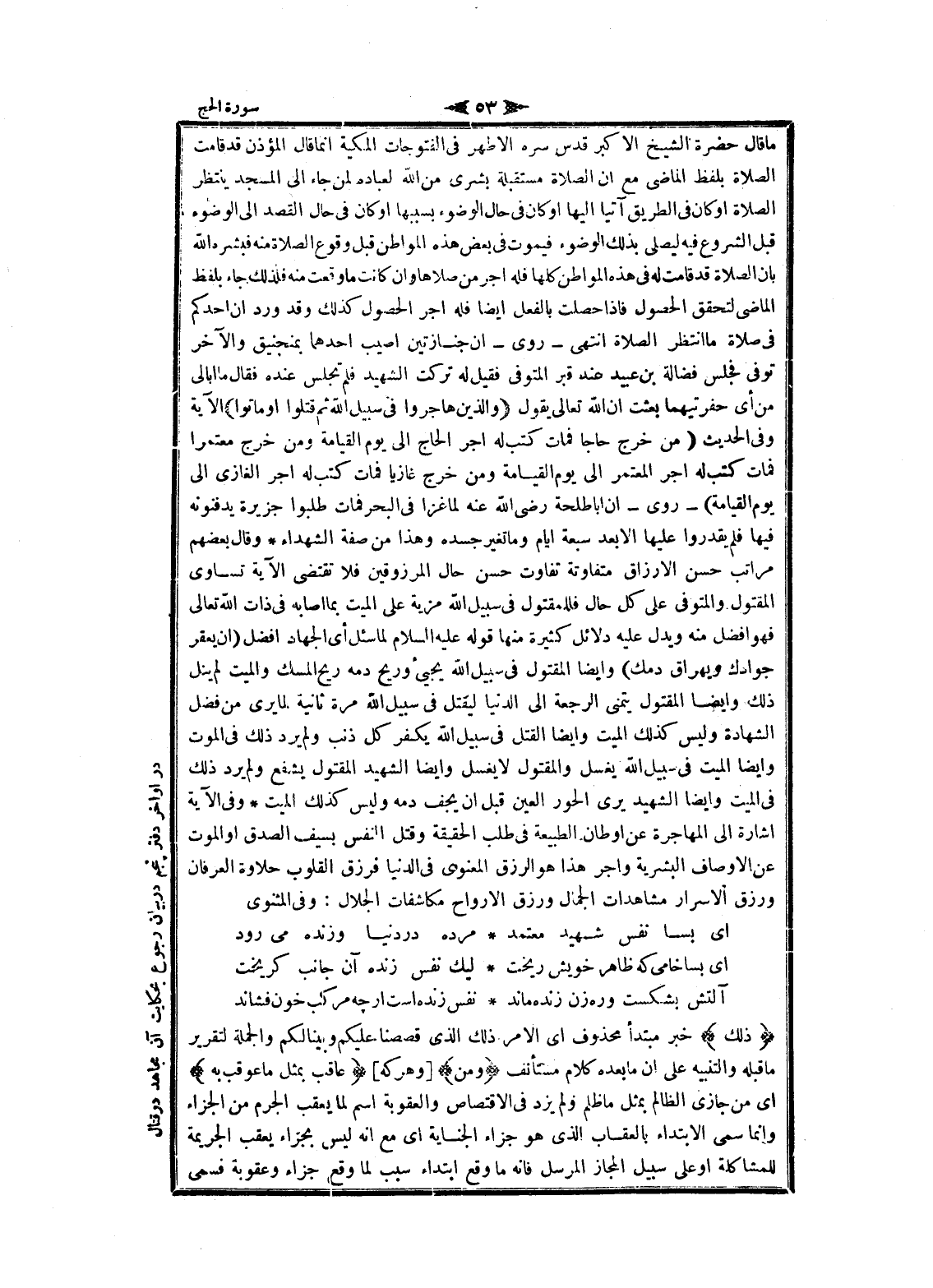 ما قال حضرة الشيخ الأكبر قدس سره الأطهر فى الفتوحات المكية انما قال المؤذن قد قامت الصلاة بلفظ الماضي مع ان الصلاة مستقبلة بشرى من الله لعباده لمن جاء الى المسجد ينتظر الصلاة او كان فى الطريق آتيا إليها او كان فى حال الوضوء بسببها او كان فى حال القصد الى الوضوء قبل الشروع فيه ليصلى بذلك الوضوء فيموت فى بعض هذه المواطن قبل وقوع الصلاة منه فبشره الله بان الصلاة قد قامت له فى هذه المواطن كلها فله اجر من صلاها وان كانت ما وقعت منه فلذلك جاء بلفظ الماضي لتحقق الحصول فاذا حصلت بالفعل ايضا فله اجر الحصول كذلك وقد ورد ان أحدكم فى صلاة ما انتظر الصلاة انتهى- روى- ان جنازتين أصيب أحدهما بمنجنيق والآخر توفى فجلس فضالة بن عبيد عند قبر المتوفى فقيل له تركت الشهيد فلم تجلس عنده فقال ما أبالي من أي حفرتيهما بعثت ان الله تعالى يقول (وَالَّذِينَ هاجَرُوا فِي سَبِيلِ اللَّهِ ثُمَّ قُتِلُوا أَوْ ماتُوا) الآية وفى الحديث (من خرج حاجا فمات كتب له اجر الحاج الى يوم القيامة ومن خرج معتمرا فمات كتب له اجر المعتمر الى يوم القيامة ومن خرج غازيا فمات كتب له اجر الغازي الى يوم القيامة) - روى- ان أبا طلحة رضى الله عنه لما غزا فى البحر فمات طلبوا جزيرة يدفنونه فيها فلم يقدروا عليها الا بعد سبعة ايام وما تغير جسده وهذا من صفة الشهداء وقال بعضهم مراتب حسن الأرزاق متفاوتة تفاوت حسن حال المرزوقين فلا تقتضى الآية تساوى المقتول والمتوفى على كل حال فللمقتول فى سبيل الله مزية على الميت بما أصابه فى ذات الله تعالى فهو أفضل منه ويدل عليه دلائل كثيرة منها قوله عليه السلام لما سئل أي الجهاد أفضل (ان يعقر جوادك ويهراق دمك) وايضا المقتول فى سبيل الله يجيئ وريح دمه ريح المسك والميت لم ينل ذلك وايضا المقتول يتمنى الرجعة الى الدنيا ليقتل فى سبيل الله مرة ثانية لما يرى من فضل الشهادة وليس كذلك الميت وايضا القتل فى سبيل الله يكفر كل ذنب ولم يرد ذلك فى الموت وايضا الميت فى سبيل الله يغسل والمقتول لا يغسل وايضا الشهيد المقتول يشفع ولم يرد ذلك فى الميت وايضا الشهيد يرى الحور العين قبل ان يجف دمه وليس كذلك الميت وفى الآية اشارة الى المهاجرة عن أوطان الطبيعة فى طلب الحقيقة وقتل النفس بسيف الصدق او الموت عن الأوصاف البشرية واجر هذا هو الرزق المعنوي فى الدنيا فرزق القلوب حلاوة العرفان ورزق الاسرار مشاهدات الجمال ورزق الأرواح مكاشفات الجلال: وفى المثنوى