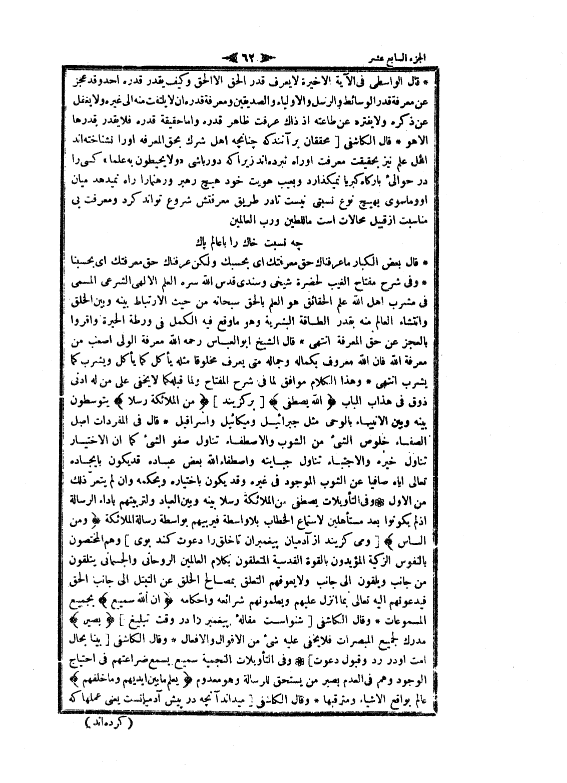قال بعض الكبار ما عرفناك حق معرفتك اى بحسبك ولكن عرفناك حق معرفتك اى بحسبنا وفى شرح مفتاح الغيب لحضرة شيخى وسندى قدس الله سره العلم الإلهي الشرعي المسمى فى مشرب اهل الله علم الحقائق هو العلم بالحق سبحانه من حيث الارتباط بينه وبين الخلق وانتشاء العالم منه بقدر الطاقة البشرية وهو ما وقع فيه الكمل فى ورطة الحيرة وأقروا بالعجز عن حق المعرفة انتهى قال الشيخ ابو العباس رحمه الله معرفة الولي أصعب من معرفة الله فان الله معروف بكماله وجماله متى يعرف مخلوقا مثله يأكل كما يأكل ويشرب كما يشرب انتهى وهذا الكلام موافق لما فى شرح المفتاح ولما قبله كما لا يخفى على من له ادنى ذوق فى هذاب الباب اللَّهُ يَصْطَفِي [بركزيند] مِنَ الْمَلائِكَةِ رُسُلًا يتوسطون بينه وبين الأنبياء بالوحى مثل جبرائيل وميكائيل واسرافيل قال فى المفردات اصل الصفاء خلوص الشيء من الشوب والاصطفاء تناول صفو الشيء كما ان الاختيار تناول خيره والاجتباء تناول جبايته واصطفاء الله بعض عباده قد يكون بايجاده تعالى إياه صافيا عن الثوب الموجود فى غيره وقد يكون باختياره وبحكمه وان لم يتعرّ ذلك من الاول وفى التأويلات يصطفى من الملائكة رسلا بينه وبين العباد ولتربيتهم بأداء الرسالة إذ لم يكونوا بعد مستأهلين لاستماع الخطاب بلا واسطة فيربيهم بواسطة رسالة الملائكة وَمِنَ النَّاسِ [ومى كزيند از آدميان پيغمبران تا خلق را دعوت كند بوى] وهم المختصون بالنفوس الزكية المؤيدون بالقوة القدسية المتعلقون بكلام العالمين الروحاني والجسماني يتلقون من جانب ويلقون الى جانب ولا يعوقهم التعلق بمصالح الخلق عن التبتل الى جانب الحق فيدعونهم اليه تعالى بما انزل عليهم ويعلمونهم شرائعه وأحكامه إِنَّ اللَّهَ سَمِيعٌ بجميع المسموعات وقال الكاشفى [شنواست مقاله پيغمبر را در وقت تبليغ] بَصِيرٌ مدرك لجميع المبصرات فلا يخفى عليه شىء من الأقوال والافعال وقال الكاشفى [بينا بحال امت او در رد وقبول دعوت] وفى التأويلات النجمية سميع يسمع ضراعتهم فى احتياج الوجود وهم فى العدم بصير من يستحق للرسالة وهو معدوم يَعْلَمُ ما بَيْنَ أَيْدِيهِمْ وَما خَلْفَهُمْ عالم بواقع الأشياء ومترقبها وقال الكاشفى [ميداند آنچهـ در پيش آدميانست يعنى عملها كه
