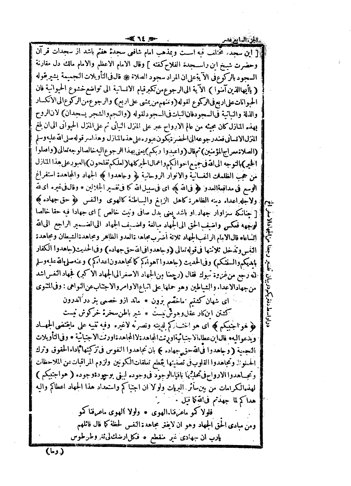 [اين سجد، مختلف فيه است وبمذهب امام شافعى سجده هفتم باشد از سجدات قرآن وحضرت شيخ اين را سجدة الفلاح كفته] وقال الامام الأعظم والامام مالك دل مقارنة السجود بالركوع فى الآية على ان المراد سجود الصلاة قال فى التأويلات النجمية يشير بقوله (يا أَيُّهَا الَّذِينَ آمَنُوا) الآية الى الرجوع من تكبر قيام الانسانية الى تواضع خشوع الحيوانية فان الحيوانات على اربع فى الركوع لقوله (وَمِنْهُمْ مَنْ يَمْشِي عَلى أَرْبَعٍ) والرجوع من الركوع الى الانكسار والذلة والنباتية فى السجود فان النبات فى السجود لقوله (وَالنَّجْمُ وَالشَّجَرُ يَسْجُدانِ) لان الروح بهذه المنازل كان مجيئه من عالم الأرواح عبر على المنزل النباتي ثم على المنزل الحيواني الى ان بلغ المنزل الإنساني فعند رجوعه الى الحضرة يكون عبوره على هذه المنازل وهذا سر قوله صلى الله عليه وسلم (الصلاة معراج المؤمنين) ثم قال (وَاعْبُدُوا رَبَّكُمْ) يعنى بهذا الرجوع اليه خالصا لوجه تعالى (وَافْعَلُوا الْخَيْرَ) بالتوجه الى الله فى جميع أحوالكم واعمال الخير كلها (لَعَلَّكُمْ تُفْلِحُونَ) بالعبور على هذا المنازل من حجب الظلمات النفسانية والأنوار الروحانية وَجاهِدُوا الجهاد والمجاهدة استفراغ الوسع فى مدافعة العدو فِي اللَّهِ اى فى سبيل الله كما فى تفسير الجلالين وقال فى غيره اى لله ولاجله اعداء دينه الظاهرة كاهل الزيغ والباطنة كالهوى والنفس حَقَّ جِهادِهِ [چنانكه سزاوار جهاد او باشد يعنى بدل صافى ونيت خالص] اى جهادا فيه حقا خالصا لوجهه فعكس وأضيف الحق الى الجهاد مبالغة وأضيف الجهاد الى الضمير الراجع الى الله اتساعا قال الامام الراغب الجهاد ثلاثة اضرب مجاهدة العدو الظاهر ومجاهدة الشيطان ومجاهدة النفس وتدخل ثلاثتها فى قوله تعالى (وَجاهِدُوا فِي اللَّهِ حَقَّ جِهادِهِ) وفى الحديث (جاهدوا الكفار بايديكم والسنتكم) وفى الحديث (جاهدوا أهواءكم كما تجاهدون أعداءكم) وعنه صلى الله عليه وسلم انه رجع من غزوة تبوك فقال (رجعنا من الجهاد الأصغر الى الجهاد الأكبر) فجهاد النفس أشد من جهاد الأعداء والشياطين وهو حملها على اتباع الأوامر والاجتناب عن النواهي: وفى المثنوى
