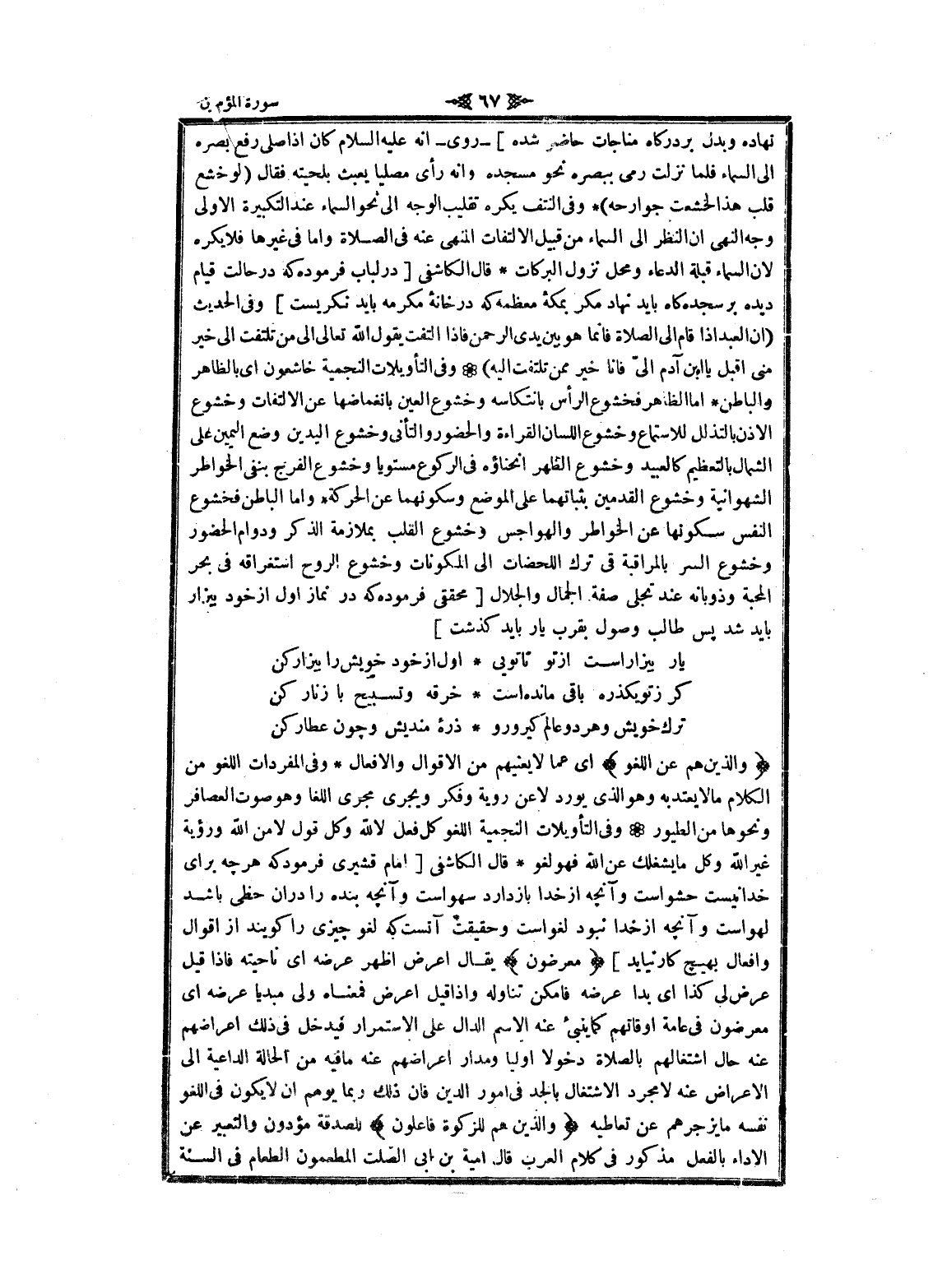 نهاده وبدل بر دركاه مناجات حاضر شده]- روى- انه عليه السلام كان إذا صلى رفع بصره الى السماء فلما نزلت رمى ببصره نحو مسجده وانه رأى مصليا يبعث بلحيته فقال (لو خشع قلب هذا لخشعت جوارحه) وفى النتف يكره تقليب الوجه الى نحو السماء عند التكبيرة الاولى وجه النهى ان النظر الى السماء من قبيل الالتفات المنهي عنه فى الصلاة واما فى غيرها فلا يكره لان السماء قبلة الدعاء ومحل نزول البركات قال الكاشفى [در لباب فرموده كه در حالت قيام ديده بر سجده كاه بايد نهاد مكر بمكه معظمه كه در خانه مكرمه بايد نكريست] وفى الحديث (ان العبد إذا قام الى الصلاة فانما هو بين يدى الرحمن فاذا التفت يقول الله تعالى الى من تلتفت الى خير منى اقبل يا ابن آدم الىّ فانا خير ممن تلتفت اليه) وفى التأويلات النجمية خاشعون الى بالظاهر والباطن اما الظاهر فخشوع الرأس بانتكاسه وخشوع العين بانغماضها عن الالتفات وخشوع الاذن بالتذلل للاستماع وخشوع اللسان القراءة والحضور والتأنى وخشوع اليدين وضع اليمين على الشمال بالتعظيم كالعبيد وخشوع الظهر انحناؤه فى الركوع مستويا وخشوع الفرج بنفي الخواطر الشهوانية وخشوع القدمين بثباتهما على الموضع وسكونهما عن الحركة واما الباطن فخشوع النفس سكونها عن الخواطر والهواجس وخشوع القلب بملازمة الذكر ودوام الحضور وخشوع السر بالمراقبة فى ترك اللحظات الى المكونات وخشوع الروح استغراقه فى بحر المحبة وذوبانه عند تجلى صفة الجمال والجلال [محققى فرموده كه در نماز أول از خود بيزار بايد شد پس طالب وصول بقرب يار بايد كذشت]