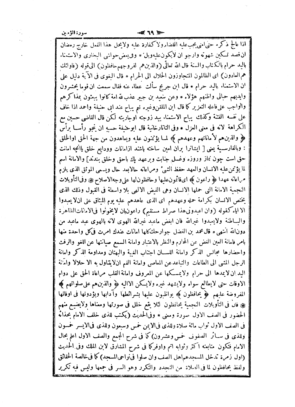 إذا عالج ذكره حتى امنى يجب عليه القضاء ولا كفارة عليه ولا يحل هذا الفعل خارج رمضان ان قصد تسكين شهوته وأرجو ان لا يكون عليه ويل وفى بعض حواشى البخاري والاستمناء باليد حرام بالكتاب والسنة قال الله تعالى (وَالَّذِينَ هُمْ لِفُرُوجِهِمْ حافِظُونَ) الى قوله (فَأُولئِكَ هُمُ العادُونَ) اى الظالمون المتجاوزون الحلال الى الحرام قال البغوي فى الآية دليل على ان الاستمناء باليد حرام قال ابن جريج سألت عطاء عنه فقال سمعت ان قوما يحشرون وأيديهم حبالى وأظنهم هؤلاء وعن سعيد بن جبير عذب لله امة كانوا يبعثون بمذاكرهم والواجب على فاعله التعزير كما قال ابن الملقن وغيره نعم يباح عند ابى حنيفة واحمد إذا خاف على نفسه الفتنة وكذلك يباح الاستمناء بيد زوجته او جاريته لكن قال القاضي حسين مع الكراهة لانه فى معنى العزل وفى التاتارخانية قال ابو حنيفة حسبه ان ينجو رأسا برأس وَالَّذِينَ هُمْ لِأَماناتِهِمْ وَعَهْدِهِمْ لما يؤتمنون عليه ويعاهدون من جهة الحق او الخلق: وبالفارسية يعنى [ايشانرا بران أمين ساخته باشند از أمانات وودائع خلق يا آنچهـ امانت حق است چون نماز وروزه وغسل جنابت وبر عهد پاك با حق وخلق بندند] والامانة اسم لما يؤتمن عليه الإنسان والعهد حفظ الشيء ومراعاته حالا بعد حال ويسمى الموثق الذي يلزم مراعاته عهدا راعُونَ اى قائمون عليها وحافظون لها على وجه الإصلاح وفى التأويلات النجمية الامانة التي حملها الإنسان وهى الفيض الإلهي بلا واسطة فى القبول وذلك الذي يختص الإنسان بكرامة حمله وعهدهم اى الذي عاهدهم عليه يوم الميثاق على ان لا يعبدوا الا إياه كقوله (وَأَنِ اعْبُدُونِي هذا صِراطٌ مُسْتَقِيمٌ) راعون بان لا يخونوا فى الأمانات الظاهرة والباطنة ولا يعبدوا غير الله فان ابغض ما عبد غير الله الهوى لانه بالهوى عبد ما عبد من دون الله انتهى قال محمد بن الفضل جوارحك كلها أمانات عندك أمرت فى كل واحدة منها بامر فامانة العين الغض عن المحارم والنظر بالاعتبار وامانة السمع صيانتها عن اللغو والرفث وإحضارها مجالس الذكر وامانة اللسان اجتناب الغيبة والبهتان ومداومة الذكر وامانة الرجل المشي الى الطاعات والتباعد عن المعاصي وامانة الفم ان لا يتناول به الا حلالا وامانة اليد ان لا يمدها الى حرام ولا يمسكها عن المعروف وامانة القلب مراعاة الحق على دوام الأوقات حتى لا يطالع سواه ولا يشهد غيره ولا يسكن الا اليه وَالَّذِينَ هُمْ عَلى صَلَواتِهِمْ المفروضة عليهم يُحافِظُونَ يواظبون عليها بشرائطها وآدابها ويؤدونها فى أوقاتها قال فى التأويلات النجمية يحافظون لئلا يقع خلل فى صورتها ومعناها ولا يضيع منهم الحضور فى الصف الاول صورة ومعنى وفى الحديث (يكتب للذى خلف الامام بحذائه فى الصف الاول ثواب مائة صلاة وللذى فى الايمن خمس وسبعون وللذى فى الأيسر خمسون وللذى فى سائر الصفوف خمس وعشرون) كما فى شرح المجمع والصف الاول اعلم بحال الامام فتكون متابعته اكثر وثوابه أتم وأوفر كما فى شرح المشارق لابن الملك وفى الحديث (أول زمرة تدخل المسجد هم اهل الصف وان صلوا فى نواحى المسجد) كما فى خالصة الحقائق ولفظ يحافظون لما فى الصلاة من التجدد والتكرر وهو السر فى جمعها وليس فيه تكرير