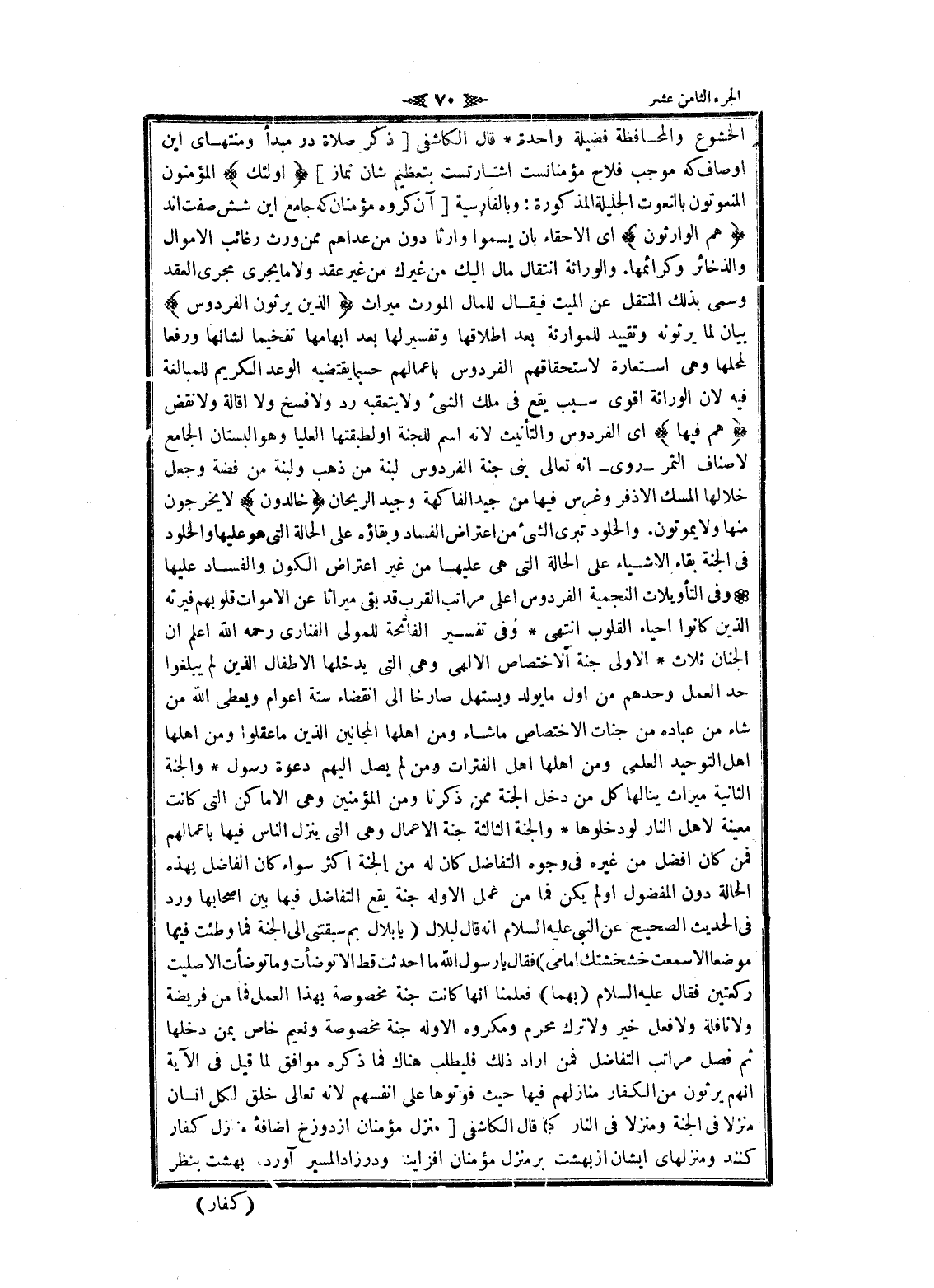 الخشوع والمحافظة فضيلة واحدة قال الكاشفى [ذكر صلاة در مبدأ ومنتهاى اين أوصاف كه موجب فلاح مؤمنانست اشارتست بتعظيم شان نماز] أُولئِكَ المؤمنون المنعوتون بالنعوت الجليلة المذكورة: وبالفارسية [آن كروه مؤمنان كه جامع اين شش صفت اند هُمُ الْوارِثُونَ اى الاحقاء بان يسموا وارثا دون من عداهم ممن ورث رغائب الأموال والذخائر وكرائمها. والوراثة انتقال مال إليك من غيرك من غير عقد ولا ما يجرى مجرى العقد وسمى بذلك المنتقل عن الميت فيقال للمال المورث ميراث الَّذِينَ يَرِثُونَ الْفِرْدَوْسَ بيان لما يرثونه وتقييد للموارثة بعد إطلاقها وتفسير لها بعد ابهامها تفخيما لشانها ورفعا لمحلها وهى استعارة لاستحقاقهم الفردوس بأعمالهم حسبما يقتضيه الوعد الكريم للمبالغة فيه لان الوراثة أقوى سبب يقع فى ملك الشيء ولا يتعقبه رد ولا فسخ ولا إقالة ولا نقض هُمْ فِيها اى الفردوس والتأنيث لانه اسم للجنة او لطبقتها العليا وهو البستان الجامع لاصناف الثمر- روى- انه تعالى بنى جنة الفردوس لبنة من ذهب ولبنة من فضة وجعل خلالها المسك الأذفر وغرس فيها من جيد الفاكهة وجيد الريحان خالِدُونَ لا يخرجون منها ولا يموتون. والخلود تبرى الشيء من اعتراض الفساد وبقاؤه على الحالة التي هو عليها والخلود فى الجنة بقاء الأشياء على الحالة التي هى عليها من غير اعتراض الكون والفساد عليها وفى التأويلات النجمية الفردوس أعلى مراتب القرب قد بقي ميراثا عن الأموات قلوبهم فيرثه الذين كانوا احياء القلوب انتهى وفى تفسير الفاتحة للمولى الفنارى رحمه الله اعلم ان الجنان ثلاث الاولى جنة الاختصاص الإلهي وهى التي يدخلها الأطفال الذين لم يبلغوا حد العمل وحدهم من أول ما يولد ويستهل صارخا الى انقضاء ستة أعوام ويعطى الله من شاء من عباده من جنات الاختصاص ما شاء ومن أهلها المجانين الذين ما عقلوا ومن أهلها اهل التوحيد العلمي ومن أهلها اهل الفترات ومن لم يصل إليهم دعوة رسول والجنة الثانية ميراث ينالها كل من دخل الجنة ممن ذكرنا ومن المؤمنين وهى الأماكن التي كانت معينة لاهل النار لو دخلوها والجنة الثالثة جنة الأعمال وهى التي ينزل الناس فيها بأعمالهم فمن كان أفضل من غيره فى وجوه التفاضل كان له من الجنة اكثر سواء كان الفاضل بهذه الحالة دون المفضول او لم يكن فما من عمل إلا وله جنة يقع التفاضل فيها بين أصحابها ورد فى الحديث الصحيح عن النبي عليه السلام انه قال لبلال (يا بلال بم سبقتنى الى الجنة فما وطئت فيها موضعا الا سمعت خشخشتك امامى) فقال يا رسول الله ما أحدثت قط الا توضأت وما توضأت الا صليت ركعتين فقال عليه السلام (بهما) فعلمنا انها كانت جنة مخصوصة بهذا العمل فما من فريضة ولا نافلة ولا فعل خير ولا ترك محرم ومكروه إلا وله جنة مخصوصة ونعيم خاص بمن دخلها ثم فصل مراتب التفاضل فمن أراد ذلك فليطلب هناك فما ذكره موافق لما قيل فى الآية انهم يرثون من الكفار منازلهم فيها حيث فوتوها على أنفسهم لانه تعالى خلق لكل انسان منزلا فى الجنة ومنزلا فى النار كما قال الكاشفى [منزل مؤمنان از دوزخ اضافه منازل كفار كنند ومنزلهاى ايشان از بهشت بر منزل مؤمنان افزايند ودر زاد المسير آورده بهشت بنظر