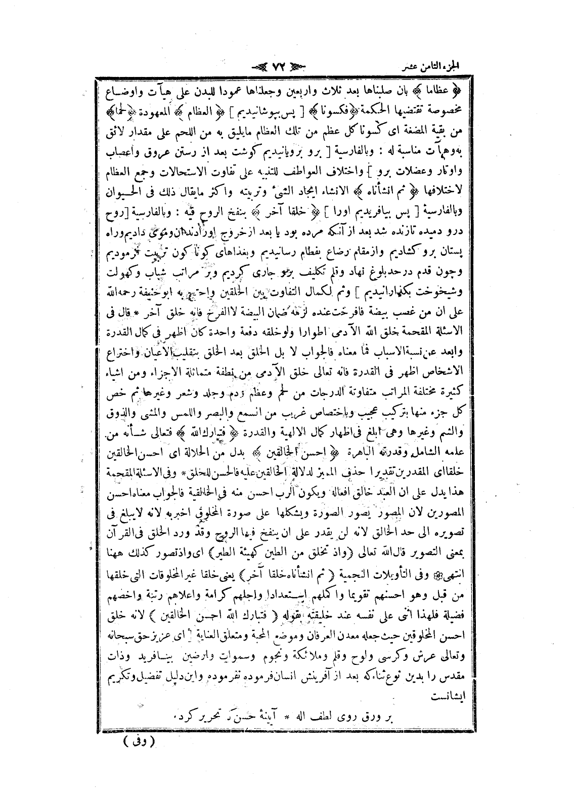 عِظاماً بان صلبناها بعد ثلاث وأربعين وجعلناها عمودا للبدن على هيآت وأوضاع مخصوصة تقتضيها الحكمة فَكَسَوْنَا [پس بپوشانيديم] الْعِظامَ المعهودة لَحْماً من بقية المضغة اى كسونا كل عظم من تلك العظام ما يليق به من اللحم على مقدار لائق به وهيآت مناسبة له: وبالفارسية [برو برويانيديم كوشت بعد از رستن عروق واعصاب وأوتار وعضلات برو] واختلاف العواطف للتنبيه على تفاوت الاستحالات وجمع العظام لاختلافها ثُمَّ أَنْشَأْناهُ الإنشاء إيجاد الشيء وتربيته واكثر ما يقال ذلك فى الحيوان وبالفارسية [پس بيافريديم او را] خَلْقاً آخَرَ بنفخ الروح فيه: وبالفارسية [روح درو دميده تا زنده شد بعد از آنكه مرده بود يا بعد از خروج او را دندان وموى داديم وراه پستان برو كشاديم واز مقام رضاع بفطام رسانيديم وبغذاهاى كوناكون تربيت فرموديم و چون قدم در حد بلوغ نهاد وقلم تكليف برو جارى كرديم وبر مراتب شباب وكهولت وشيخوخت بگذارانيديم] وثم لكمال التفاوت بين الخلقين واحتج به ابو حنيفة رحمه الله على ان من غصب بيضة فافرخت عنده لزمه ضمان البيضة لا الفرخ فانه خلق آخر قال فى الاسئلة