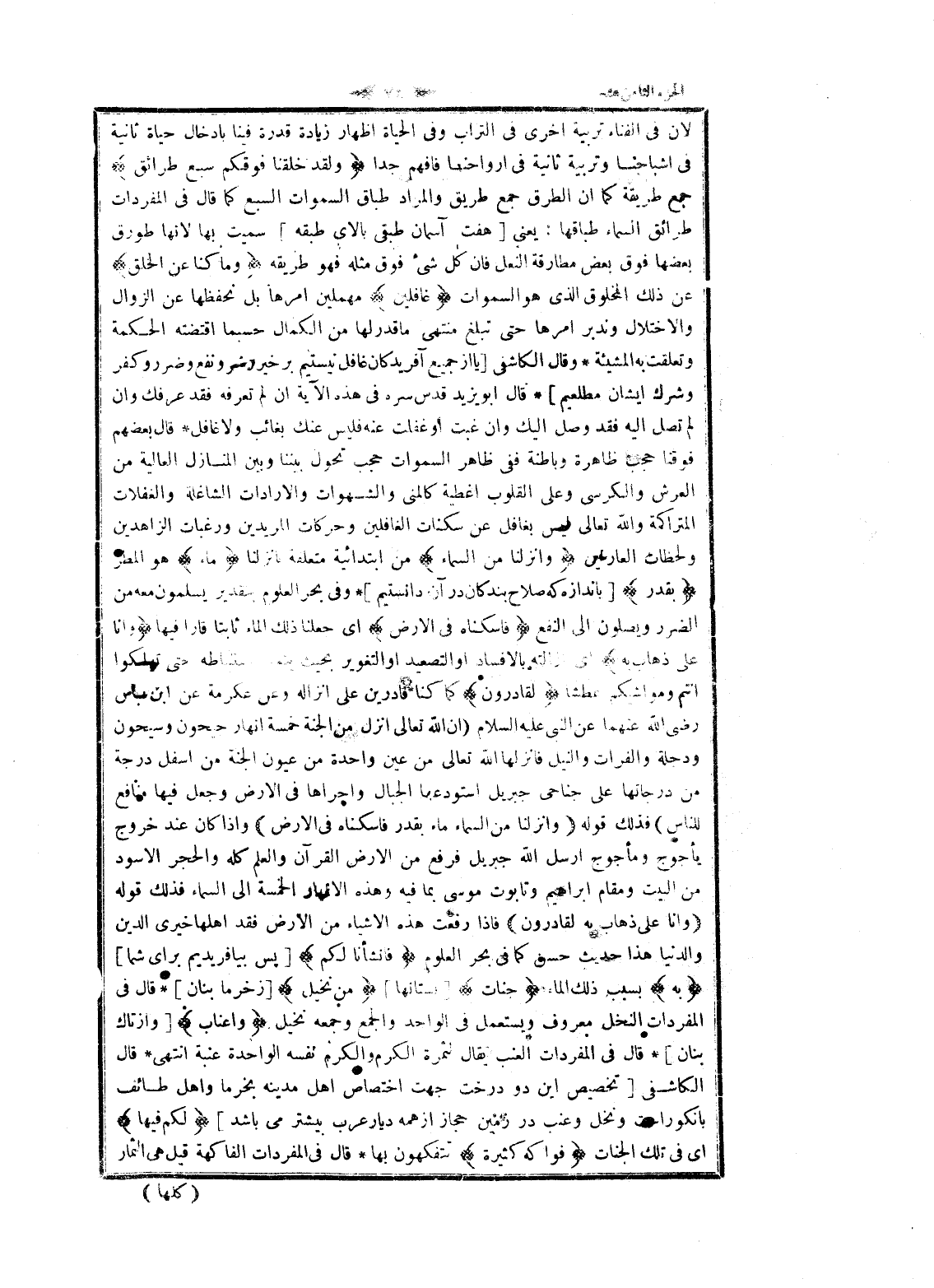لان فى الفناء تربية اخرى فى التراب وفى الحياة اظهار زيادة قدرة فينا بإدخال حياة ثانية فى أشباحنا وتربية ثانية فى أرواحنا فافهم جدا وَلَقَدْ خَلَقْنا فَوْقَكُمْ سَبْعَ طَرائِقَ جمع طريقة كما ان الطرق جمع طريق والمراد طباق السموات السبع كما قال فى المفردات طرائق السماء طباقها: يعنى [هفت آسمان طبقى بالاى طبقه] سميت بها لانها طورق بعضها فوق بعض مطارقة النعل فان كل شىء فوق مثله فهو طريقه وَما كُنَّا عَنِ الْخَلْقِ عن ذلك المخلوق الذي هو السموات غافِلِينَ مهملين أمرها بل نحفظها عن الزوال والاختلال وندبر أمرها حتى تبلغ منتهى ما قدر لها من الكمال حسبما اقتضته الحكمة وتعلقت به المشيئة وقال الكاشفى [يا از جميع آفريدگان غافل نيستيم بر خير وشر ونفع وضرر وكفر وشرك ايشان مطلعيم] قال ابو يزيد قدس سره فى هذه الآية ان لم تعرفه فقد عرفك وان لم تصل اليه فقد وصل إليك وان غبت او غفلت عنه فليس عنك بغائب ولا غافل قال بعضهم فوقنا حجب ظاهرة وباطنة ففى ظاهر السموات حجب تحول بيننا وبين المنازل العالية من العرش والكرسي وعلى القلوب اغطية كالمنى والشهوات والإرادات الشاغلة والغفلات المتراكمة والله تعالى ليس بغافل عن سكنات الغافلين وحركات المريدين ورغبات الزاهدين ولحظات العارفين وَأَنْزَلْنا مِنَ السَّماءِ من ابتدائية متعلقة بانزلنا ماءً هو المطر بِقَدَرٍ [باندازه كه صلاح بندگان در آن دانستيم] وفى بحر العلوم بتقدير يسلمون معه من الضرر ويصلون الى النفع فَأَسْكَنَّاهُ فِي الْأَرْضِ اى جعلنا ذلك الماء ثابتا قارا فيها وَإِنَّا عَلى ذَهابٍ بِهِ اى إزالته بالإفساد او التصعيد او التغوير بحيث يتعذر استنباطه حتى تهلكوا أنتم ومواشيكم عطشا لَقادِرُونَ كما كنا قادرين على انزاله وعن عكرمة عن ابن عباس رضى الله عنهما عن النبي عليه السلام (ان الله تعالى انزل من الجنة خمسة انهار جيحون وسيحون ودجلة والفرات والنيل فانزلها الله تعالى من عين واحدة من عيون الجنة من أسفل درجة من درجاتها على جناحى جبريل استودعها الجبال وأجراها فى الأرض وجعل فيها منافع للناس) فذلك قوله (وَأَنْزَلْنا مِنَ السَّماءِ ماءً بِقَدَرٍ فَأَسْكَنَّاهُ فِي الْأَرْضِ) وإذا كان عند خروج يأجوج ومأجوج أرسل الله جبريل فرفع من الأرض القرآن والعلم كله والحجر الأسود من البيت ومقام ابراهيم وتابوت موسى بما فيه وهذه الأنهار الخمسة الى السماء فذلك قوله (وَإِنَّا عَلى ذَهابٍ بِهِ لَقادِرُونَ) فاذا رفعت هذه الأشياء من الأرض فقد أهلها خيرى الدين والدنيا هذا حديث حسن كما فى بحر العلوم فَأَنْشَأْنا لَكُمْ [پس بيافريديم براى شما] بِهِ بسبب ذلك الماء جَنَّاتٍ [بستانها] مِنْ نَخِيلٍ [ز خرما بنان] قال فى المفردات النخل معروف ويستعمل فى الواحد والجمع وجمعه نخيل وَأَعْنابٍ [واز تاك بنان] قال فى المفردات العنب يقال لثمرة الكرم والكرم نفسه الواحدة عنبة انتهى قال الكاشفى [تخصيص اين دو درخت جهت اختصاص اهل مدينه بخرما واهل طائف بانكور است ونخل وعنب در زمين حجاز از همه ديار عرب بيشتر مى باشد] لَكُمْ فِيها اى فى تلك الجنات فَواكِهُ كَثِيرَةٌ تتفكهون بها قال فى المفردات الفاكهة قيل هى الثمار