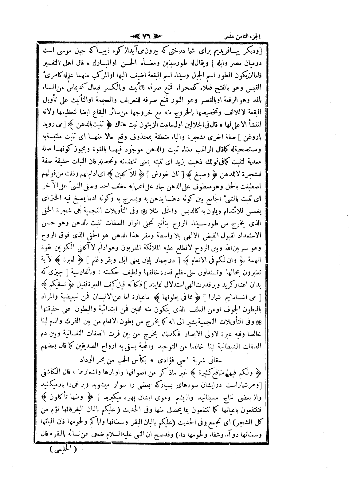 [وديكر بيافريديم براى شما درختى كه بيرون مى آيد از كوه زيبا كه جبل موسى است در ميان مصر وايله] ويقال له طور سينين ومعناه الحسن او المبارك قال اهل التفسير فاما ان يكون الطور اسم الجبل وسيناء اسم البقعة أضيف إليها او المركب منهما علم له كامرىء القيس وهو بالفتح فعلاء كصحراء فمنع صرفه للتأنيث وبالكسر فيعال كديماس من السناء بالمد وهو الرفعة او بالقصر وهو النور فمنع صرفه للتعريف والعجمة او التأنيث على تأويل البقعة لا للالف وتخصيصها بالخروج منه مع خروجها من سائر البقاع ايضا لتعظيمها ولانه المنشأ الأعلى لها قال فى الجلالين أول ما نبت الزيتون نبت هناك تَنْبُتُ بِالدُّهْنِ [مى رويد با روغن] صفة اخرى لشجرة والباء متعلقة بمحذوف وقع حالا منها اى تنبت ملتبسة به ومستصحبة له كما قال الراغب معناه تنبت والدهن موجود فيها بالقوة ويجوز كونها صلة معدية لتنبت كما فى قولك ذهبت بزيد اى تنبته بمعنى تتضمنه وتحصله فان النبات حقيقة صفة للشجرة لا للدهن وَصِبْغٍ [نان خورش] لِلْآكِلِينَ اى ادام لهم وذلك من قولهم اصطبغت بالحل وهو معطوف على الدهن جار على إعرابه عطف أحد وصفي الشيء على الآخر اى تنبت بالشيء الجامع بين كونه دهنا يدهن به ويسرج به وكونه أدما يصبغ فيه الخبز اى يغمس للائتدام ويلون به كالدبس والخل مثلا وفى التأويلات النجمية هى شجرة الخفي الذي يخرج من طور سيناء الروح بتأثير تجلى أنوار الصفات تنبت بالدهن وهو حسن الاستعداد لقبول الفيض الإلهي بلا واسطة ومقر هذا الدهن هو الخفي الذي فوق الروح وهو سر بين الله وبين الروح لا تطلع عليه الملائكة المقربون وهو ادام لا آكلى الكونين بقوة الهمة وَإِنَّ لَكُمْ فِي الْأَنْعامِ [در چهار پايان يعنى ابل وبقر وغنم] لَعِبْرَةً لآية تعتبرون بحالها وتستدلون على عظيم قدرة خالقها ولطيف حكمته: وبالفارسية [چيزى كه بدان اعتبار كريد وبر قدرت الهى استدلال نمايند] فكأنه قيل كيف العبرة فقيل نُسْقِيكُمْ [مى اشامانيم شما را] مِمَّا فِي بُطُونِها ما عبارة اما عن الألبان فمن تبعيضية والمراد بالبطون الجوف او عن العلف الذي يتكون منه اللبن فمن ابتدائية والبطون على حقيقتها وفى التأويلات النجمية يشير الى انه كما يخرج من بطون الانعام من بين الفرث والدم لبنا خالصا وفيه عبرة لاولى الابصار فكذلك يخرج من بين فرث الصفات النفسانية وبين دم الصفات الشيطانية لبنا خالصا من التوحيد والمحبة يسقى به أرواح الصديقين كما قال بعضهم