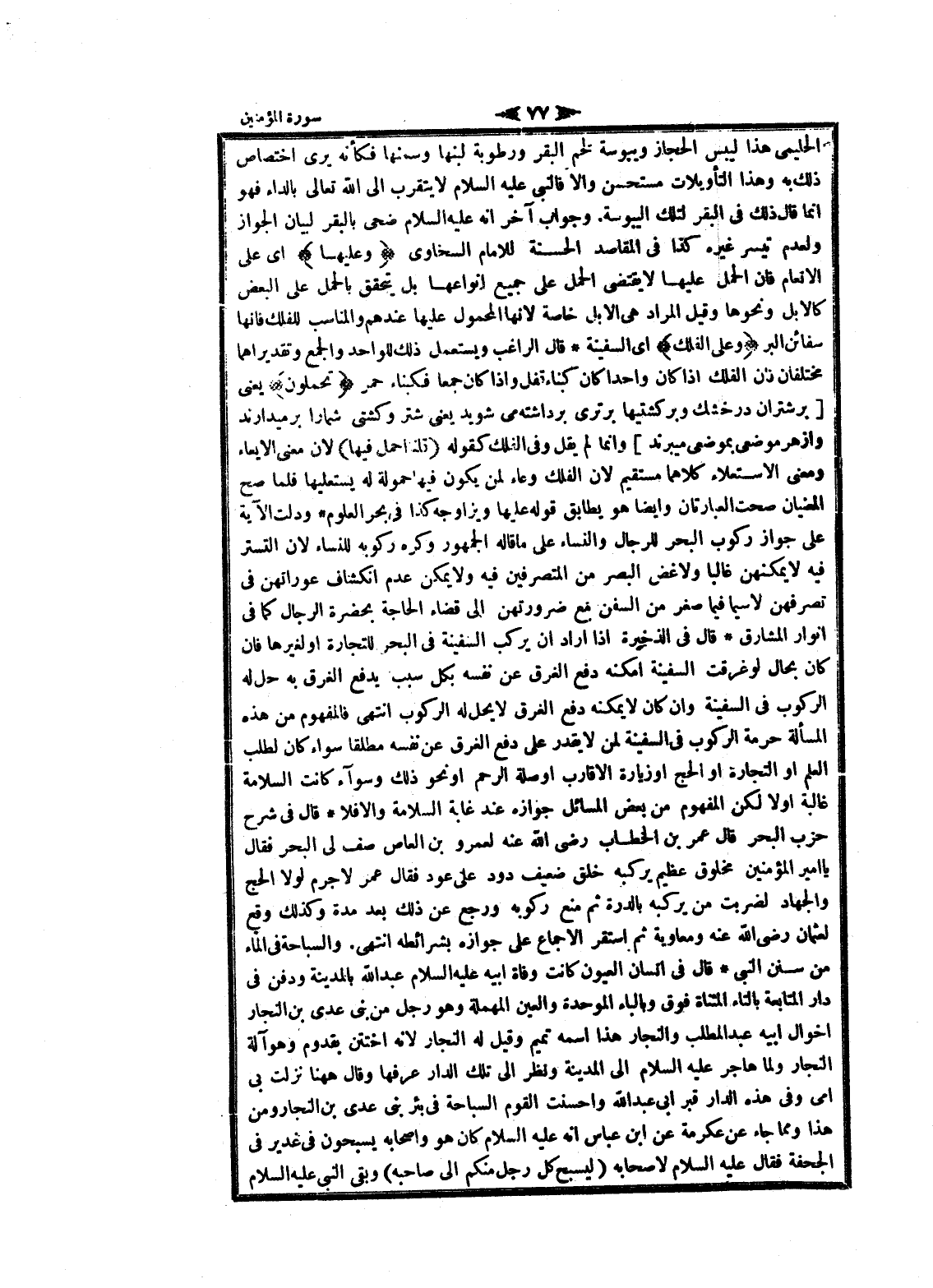 يعنى [بر شتران در خشك وبر كشتيها برترى برداشته مى شويد يعنى شتر وكشتى شما را بر ميدارند واز هر موضعى بموضعي ميبرند] وانما لم يقل وفى الفلك كقوله (قُلْنَا احْمِلْ فِيها) لان معنى الايعاء ومعنى الاستعلاء كلاهما مستقيم لان الفلك وعاء لمن يكون فيها حمولة له يستعليها فلما صح المعنيان صحت العبارتان وايضا هو يطابق قوله عليها ويزاوجه كذا فى بحر العلوم ودلت الآية على جواز ركوب البحر للرجال والنساء على ما قاله الجمهور وكره ركوبه للنساء لان التستر فيه لا يمكنهن غالبا ولا غض البصر من المتصرفين فيه ولا يمكن عدم انكشاف عوراتهن فى تصرفهن لا سيما فيما صغر من السفن مع ضرورتهن الى قضاء الحاجة بحضرة الرجال كما فى أنوار المشارق قال فى الذخيرة إذا أراد ان يركب السفينة فى البحر للتجارة او لغيرها فان كان بحال لو غرقت السفينة امكنه دفع الغرق عن نفسه بكل سبب يدفع الغرق به حل له الركوب فى السفينة وان كان لا يمكنه دفع الغرق لا يحل له الركوب انتهى فالمفهوم من هذه المسألة حرمة الركوب فى السفينة لمن لا يقدر على دفع الغرق عن نفسه مطلقا سواء كان لطلب العلم او التجارة او الحج او زيارة الأقارب او صلة الرحم او نحو ذلك وسوآء كانت السلامة غالبة او لا لكن المفهوم من بعض المسائل جوازه عند غلبة السلامة والا فلا قال فى شرح حزب البحر قال عمر بن الخطاب رضى الله عنه لعمرو بن العاص صف لى البحر فقال يا امير المؤمنين مخلوق عظيم يركبه خلق ضعيف دود على عود فقال عمر لا جرم لولا الحج والجهاد لضربت من يركبه بالدرة ثم منع ركوبه ورجع عن ذلك بعد مدة وكذلك وقع لعثمان رضى الله عنه ومعاوية ثم استقر الإجماع على جوازه بشرائطه انتهى. والسباحة فى الماء من سنن النبي قال فى انسان العيون كانت وفاة أبيه عليه السلام عبد الله بالمدينة ودفن فى دار المتابعة بالتاء المثناة فوق وبالباء الموحدة والعين المهملة وهو رجل من بنى عدى بن النجار أخوال أبيه عبد المطلب والنجار هذا اسمه تميم وقيل له النجار لانه اختتن بقدوم وهو آلة النجار ولما هاجر عليه السلام الى المدينة ونظر الى تلك الدار عرفها وقال هاهنا نزلت بي أمي وفى هذه الدار قبر ابى عبد الله وأحسنت القوم السباحة فى بئر بنى عدى بن النجار ومن هذا ومما جاء عن عكرمة عن ابن عباس انه عليه السلام كان هو وأصحابه يسبحون فى غدير فى الجحفة فقال عليه السلام لاصحابه (ليسبح كل رجل منكم الى صاحبه) وبقي النبي عليه السلام