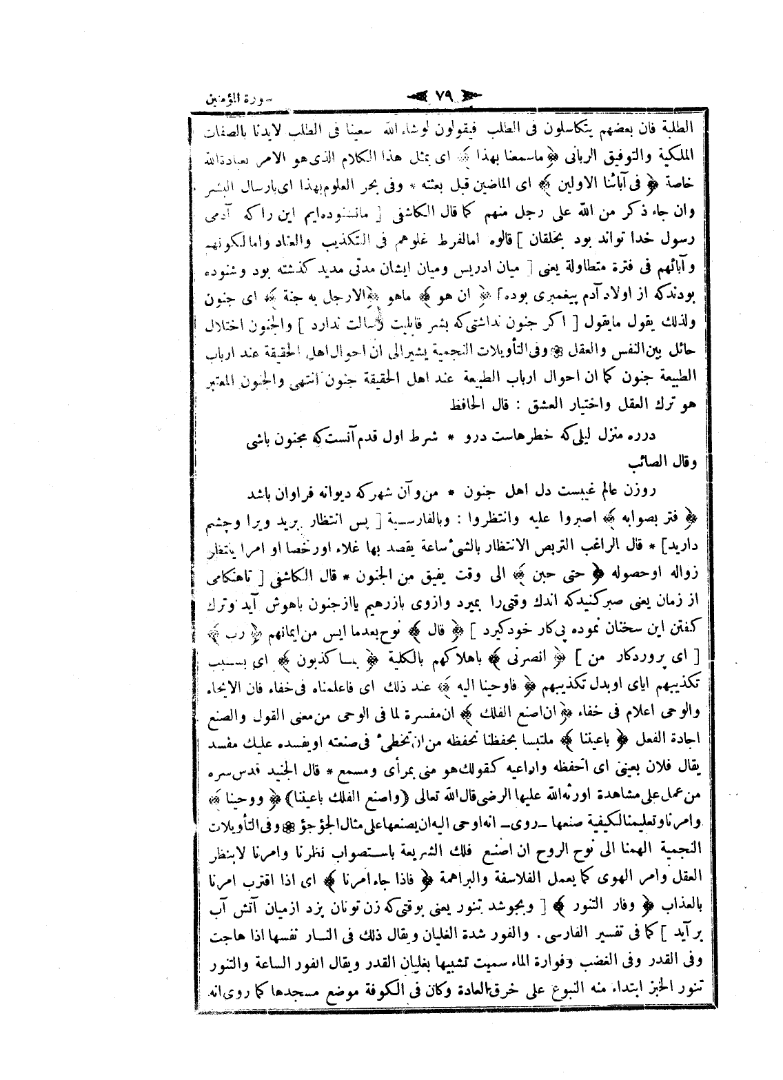 فَتَرَبَّصُوا بِهِ اصبروا عليه وانتظروا: وبالفارسية [پس انتظار بريد ويرا و چشم داريد] قال الراغب التربص الانتظار بالشيء ساعة يقصد بها غلاء او رخصا او امرا ينتظر زواله او حصوله حَتَّى حِينٍ الى وقت يفيق من الجنون قال الكاشفى [تا هنكامى از زمان يعنى صبر كنيد كه اندك وقتى را بميرد واز وى باز رهيم يا از جنون با هوش آيد وترك كفتن اين سخنان نموده پى كار خود كيرد] قالَ نوح بعد ما ايس من ايمانهم رَبِّ [اى پروردگار من] انْصُرْنِي باهلاكهم بالكلية بِما كَذَّبُونِ اى بسبب تكذيبهم إياي او بدل تكذيبهم فَأَوْحَيْنا إِلَيْهِ عند ذلك اى فاعلمناه فى خفاء فان الإيحاء والوحى اعلام فى خفاء أَنِ اصْنَعِ الْفُلْكَ ان مفسرة لما فى الوحى من معنى القول والصنع اجادة الفعل بِأَعْيُنِنا ملتبسا بحفظنا نحفظه من ان تخطئ فى صنعته او يفسده عليك مفسد يقال فلان بعيني اى احفظه واراعيه كقولك هو منى بمرأى ومسمع قال الجنيد قدس سره من عمل على مشاهدة أورثه الله عليها الرضى قال الله تعالى (أَنِ اصْنَعِ الْفُلْكَ بِأَعْيُنِنا) وَوَحْيِنا وأمرنا وتعليمنا لكيفية صنعها- روى- انه اوحى اليه ان يصنعها على مثال الجؤجؤ وفى التأويلات النجمية ألهمنا الى نوح الروح ان اصنع فلك الشريعة باستصواب نظرنا وأمرنا لا بنظر العقل وامر الهوى كما يعمل الفلاسفة والبراهمة فَإِذا جاءَ أَمْرُنا اى إذا اقترب أمرنا بالعذاب وَفارَ التَّنُّورُ [وبجوشد تنور يعنى بوقتى كه زن تو نان پزد از ميان آتش آب برآيد] كما فى تفسير الفارسي. والفور شدة الغليان ويقال ذلك فى النار نفسها إذا هاجت وفى القدر وفى الغضب وفوارة الماء سميت تشبيها بغليان القدر ويقال الفور الساعة والتنور تنور الخبز ابتداء منه النبوع على خرق العادة وكان فى الكوفة موضع مسجدها كما روى انه