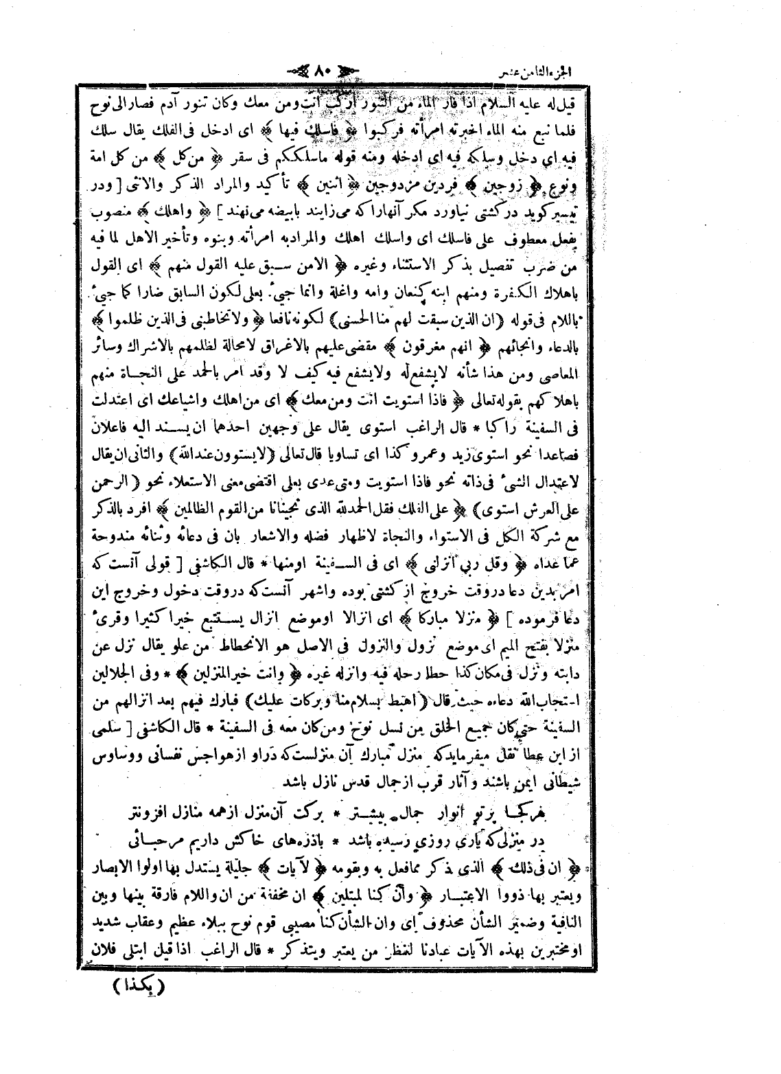 قيل له عليه السلام إذا فار الماء من التنور اركب أنت ومن معك وكان تنور آدم فصار الى نوح فلما نبع منه الماء أخبرته امرأته فركبوا فَاسْلُكْ فِيها اى ادخل فى الفلك يقال سلك فيه اى دخل وسلكه فيه اى ادخله ومنه قوله ما سلككم فى سقر مِنْ كُلٍّ من كل امة ونوع زَوْجَيْنِ فردين مزدوجين اثْنَيْنِ تأكيد والمراد الذكر والأنثى [ودر تيسير كويد در كشتى نياورد مكر آنها را كه مى زايند با بيضه مى نهند] وَأَهْلَكَ منصوب بفعل معطوف على فاسلك اى واسلك أهلك والمراد به امرأته وبنوه وتأخير الأهل لما فيه من ضرب تفصيل بذكر الاستثناء وغيره إِلَّا مَنْ سَبَقَ عَلَيْهِ الْقَوْلُ مِنْهُمْ اى القول باهلاك الكفرة ومنهم ابنه كنعان وامه واغلة وانما جيئ بعلى لكون السابق ضارا كما جيئ باللام فى قوله (إِنَّ الَّذِينَ سَبَقَتْ لَهُمْ مِنَّا الْحُسْنى) لكونه نافعا وَلا تُخاطِبْنِي فِي الَّذِينَ ظَلَمُوا بالدعاء وانجائهم إِنَّهُمْ مُغْرَقُونَ مقضى عليهم بالاغراق لا محالة لظلمهم بالاشراك وسائر المعاصي ومن هذا شأنه لا يشفع له ولا يشفع فيه كيف لا وقد امر بالحمد على النجاة منهم باهلاكهم بقوله تعالى فَإِذَا اسْتَوَيْتَ أَنْتَ وَمَنْ مَعَكَ اى من أهلك واشياعك اى اعتدلت فى السفينة راكبا قال الراغب استوى يقال على وجهين أحدهما ان يسند اليه فاعلان فصاعدا نحو استوى زيد وعمرو كذا اى تساويا قال تعالى (لا يَسْتَوُونَ عِنْدَ اللَّهِ) والثاني ان يقال لاعتدال الشيء فى ذاته نحو فاذا استويت ومتى عدى بعلى اقتضى معنى الاستعلاء نحو (الرَّحْمنُ عَلَى الْعَرْشِ اسْتَوى) عَلَى الْفُلْكِ فَقُلِ الْحَمْدُ لِلَّهِ الَّذِي نَجَّانا مِنَ الْقَوْمِ الظَّالِمِينَ أفرد بالذكر مع شركة الكل فى الاستواء والنجاة لاظهار فضله والاشعار بان فى دعائه وثنائه مندوحة عما عداه وَقُلْ رَبِّ أَنْزِلْنِي اى فى السفينة او منها قال الكاشفى [قولى آنست كه امر بدين دعا در وقت خروج از كشتى بوده وأشهر آنست كه در وقت دخول وخروج اين دعا فرموده] مُنْزَلًا مُبارَكاً اى انزالا او موضع إنزال يستتبع خيرا كثيرا وقرئ منزلا بفتح الميم اى موضع نزول والنزول فى الأصل هو الانحطاط من علو يقال نزل عن دابته ونزل فى مكان كذا حطا رحله فيه وأنزله غيره وَأَنْتَ خَيْرُ الْمُنْزِلِينَ وفى الجلالين استجاب الله دعاءه حيث قال (اهْبِطْ بِسَلامٍ مِنَّا وَبَرَكاتٍ عَلَيْكَ) فبارك فيهم بعد إنزالهم من السفينة حتى كان جميع الخلق من نسل نوح ومن كان معه فى السفينة قال الكاشفى [سلمى از ابن عطا نقل ميفرمايد كه منزل مبارك آن منزلست كه در او از هواجس نفسانى ووساوس شيطانى ايمن باشند وآثار قرب از جمال قدس نازل باشد