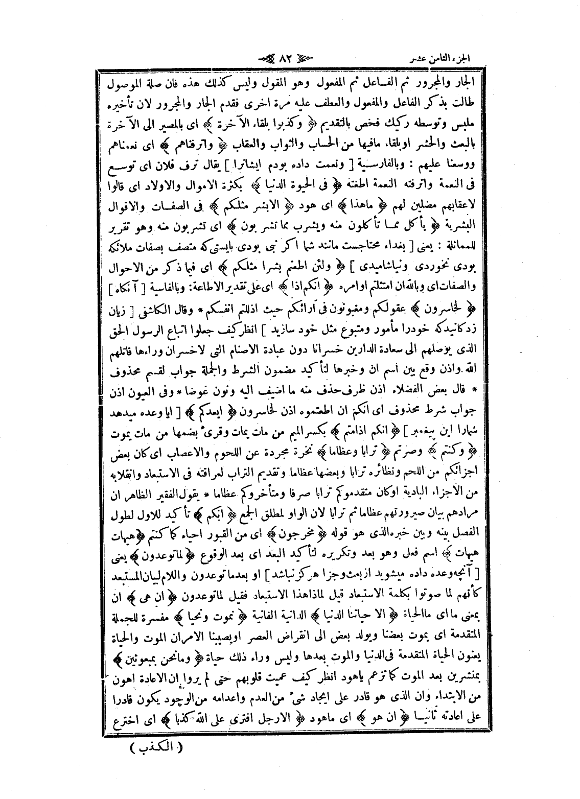 الجار والمجرور ثم الفاعل ثم المفعول وهو المقول وليس كذلك هذه فان صلة الموصول طالت بذكر الفاعل والمفعول والعطف عليه مرة اخرى فقدم الجار والمجرور لان تأخيره ملبس وتوسطه ركيك فخص بالتقديم وَكَذَّبُوا بِلِقاءِ الْآخِرَةِ اى بالمصير الى الآخرة بالبعث والحشر او بلقاء ما فيها من الحساب والثواب والعقاب وَأَتْرَفْناهُمْ اى نعمناهم ووسعنا عليهم: وبالفارسية [ونعمت داده بودم ايشانرا] يقال ترف فلان اى توسع فى النعمة وأترفته النعمة أطغته فِي الْحَياةِ الدُّنْيا بكثرة الأموال والأولاد اى قالوا لاعقابهم مضلين لهم ما هذا اى هود إِلَّا بَشَرٌ مِثْلُكُمْ فى الصفات والأقوال البشرية يَأْكُلُ مِمَّا تَأْكُلُونَ مِنْهُ وَيَشْرَبُ مِمَّا تَشْرَبُونَ اى تشربون منه وهو تقرير للمماثلة: يعنى [بغداء محتاجست مانند شما اگر نبى بودى بايستى كه متصف بصفات ملائكه بودى نخوردى ونياشاميدى] وَلَئِنْ أَطَعْتُمْ بَشَراً مِثْلَكُمْ اى فيما ذكر من الأحوال والصفات اى وبالله ان امتثلتم أوامره إِنَّكُمْ إِذاً اى على تقدير الاطاعة: وبالفارسية [آنگاه] لَخاسِرُونَ عقولكم ومغبونون فى آرائكم حيث اذللتم أنفسكم وقال الكاشفى [زيان زدكانيد كه خود را مأمور ومتبوع مثل خود سازيد] انظر كيف جعلوا اتباع الرسول الحق الذي يوصلهم الى سعادة الدارين خسرانا دون عبادة الأصنام التي لا خسران وراءها قاتلهم الله واذن وقع بين اسم ان وخبرها لتأكيد مضمون الشرط والجملة جواب لقسم محذوف قال بعض الفضلاء اذن ظرف حذف منه ما أضيف اليه ونون عوضا وفى العيون اذن جواب شرط محذوف اى انكم ان أطعتموه اذن لخاسرون أَيَعِدُكُمْ [آيا وعده ميدهد شما را اين پيغمبر] أَنَّكُمْ إِذا مِتُّمْ بكسر الميم من مات يمات وقرئ بضمها من مات يموت وَكُنْتُمْ وصرتم تُراباً وَعِظاماً نخرة مجردة عن اللحوم والاعصاب اى كان بعض اجزائكم من اللحم ونظائره ترابا وبعضها عظاما وتقديم التراب لعراقته فى الاستبعاد وانقلابه من الاجزاء البادية او كان متقدموكم ترابا صرفا ومتأخروكم عظاما يقول الفقير الظاهر ان مرادهم بيان صيرورتهم عظاما ثم ترابا لان الواو لمطلق الجمع أَنَّكُمْ تأكيد للاول لطول الفصل بينه وبين خبره الذي هو قوله مُخْرَجُونَ اى من القبور احياء كما كنتم هَيْهاتَ هَيْهاتَ اسم فعل وهو بعد وتكريره لتأكيد البعد اى بعد الوقوع لِما تُوعَدُونَ يعنى [آنچهـ وعده داده ميشويد از بعث وجزا هركز نباشد] او بعد ما توعدون واللام لبيان المستبعد كأنهم لما صوتوا بكلمة الاستبعاد قيل لماذا هذا الاستبعاد فقيل لما توعدون إِنْ هِيَ ان بمعنى ما اى ما الحياة إِلَّا حَياتُنَا الدُّنْيا الدانية الفانية نَمُوتُ وَنَحْيا مفسرة للجملة المتقدمة اى يموت بعضنا ويولد بعض الى انقراض العصر او يصيبنا الأمران الموت والحياة يعنون الحياة المتقدمة فى الدنيا والموت بعدها وليس وراء ذلك حياة وَما نَحْنُ بِمَبْعُوثِينَ بمنشرين بعد الموت كما تزعم يا هود انظر كيف عميت قلوبهم حتى لم يروا ان الاعادة أهون من الابتداء وان الذي هو قادر على إيجاد شىء من العدم واعدامه من الوجود يكون قادرا على إعادته ثانيا إِنْ هُوَ اى ما هود إِلَّا رَجُلٌ افْتَرى عَلَى اللَّهِ كَذِباً اى اخترع