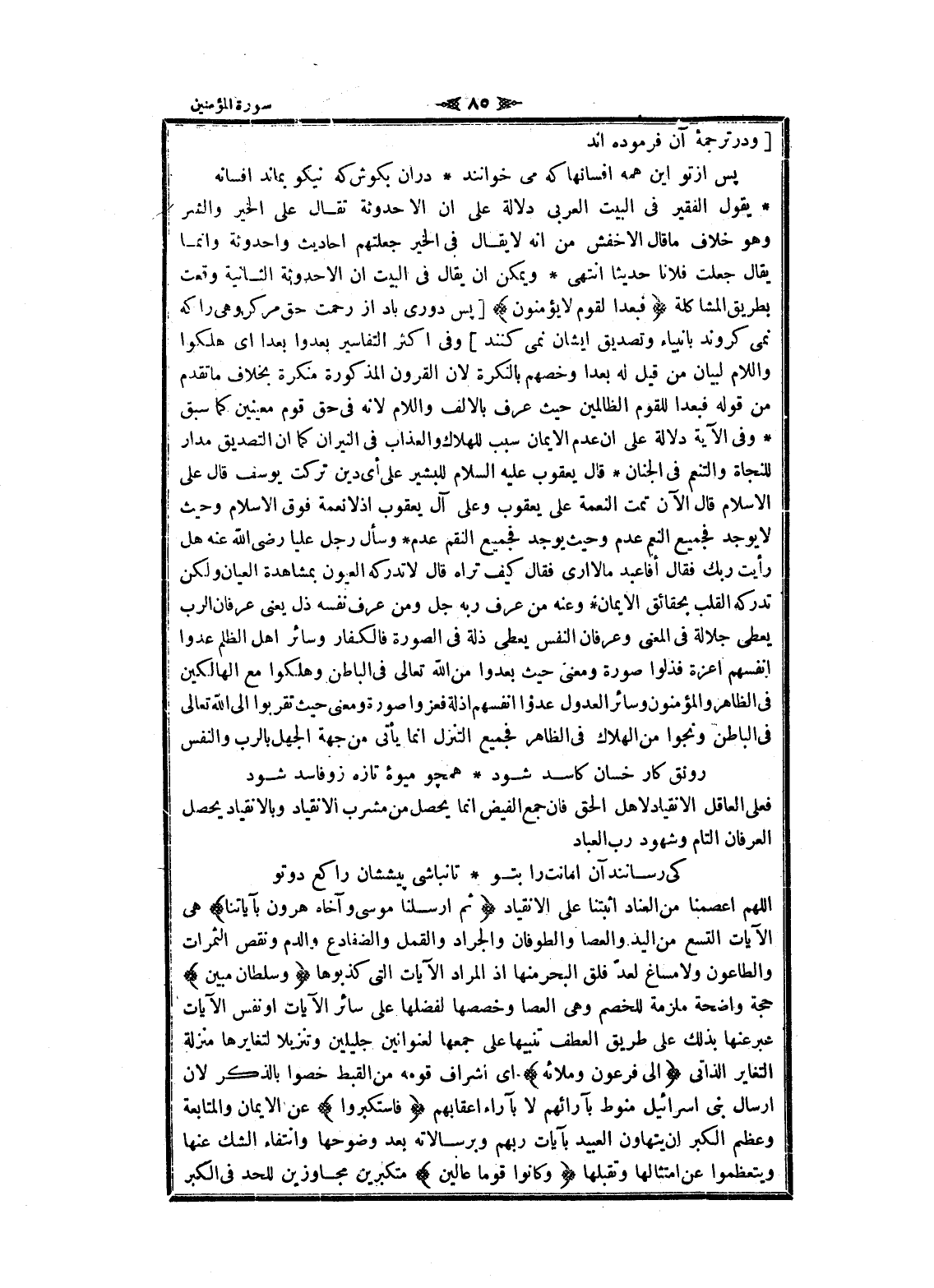 يقول الفقير فى البيت العربي دلالة على ان الاحدوثة تقال على الخير والشر وهو خلاف ما قال الأخفش من انه لا يقال فى الخير جعلتهم أحاديث واحدوثة وانما يقال جعلت فلانا حديثا انتهى ويمكن ان يقال فى البيت ان الاحدوثة الثانية وقعت بطريق المشاكلة فَبُعْداً لِقَوْمٍ لا يُؤْمِنُونَ [پس دورى باد از رحمت حق مر كروهى را كه نمى كروند بانبياء وتصديق ايشان نمى كنند] وفى اكثر التفاسير بعدوا بعدا اى هلكوا واللام لبيان من قيل له بعدا وخصهم بالنكرة لان القرون المذكورة منكرة بخلاف ما تقدم من قوله فبعدا للقوم الظالمين حيث عرف بالألف واللام لانه فى حق قوم معينين كما سبق وفى الآية دلالة على ان عدم الايمان سبب للهلاك والعذاب فى النيران كما ان التصديق مدار للنجاة والتنعم فى الجنان قال يعقوب عليه السلام للبشير على أي دين تركت يوسف قال على الإسلام قال الآن تمت النعمة على يعقوب وعلى آل يعقوب إذ لا نعمة فوق الإسلام وحيث لا يوجد فجميع النعم عدم وحيث يوجد فجميع النقم عدم وسأل رجل عليا رضى الله عنه هل رأيت ربك فقال أفأعبد ما لا ارى فقال كيف تراه قال لا تدركه العيون بمشاهدة العيان ولكن تدركه القلب بحقائق الايمان وعنه من عرف ربه جل ومن عرف نفسه ذل يعنى عرفان الرب يعطى جلالة فى المعنى وعرفان النفس يعطى ذلة فى الصورة فالكفار وسائر اهل الظلم عدوا أنفسهم اعزة فذلوا صورة ومعنى حيث بعدوا من الله تعالى فى الباطن وهلكوا مع الهالكين فى الظاهر والمؤمنون وسائر العدول عدوا أنفسهم اذلة فعزوا صورة ومعنى حيث تقربوا الى الله تعالى فى الباطن ونجوا من الهلاك فى الظاهر فجميع التنزل انما يأتى من جهة الجهل بالرب والنفس
