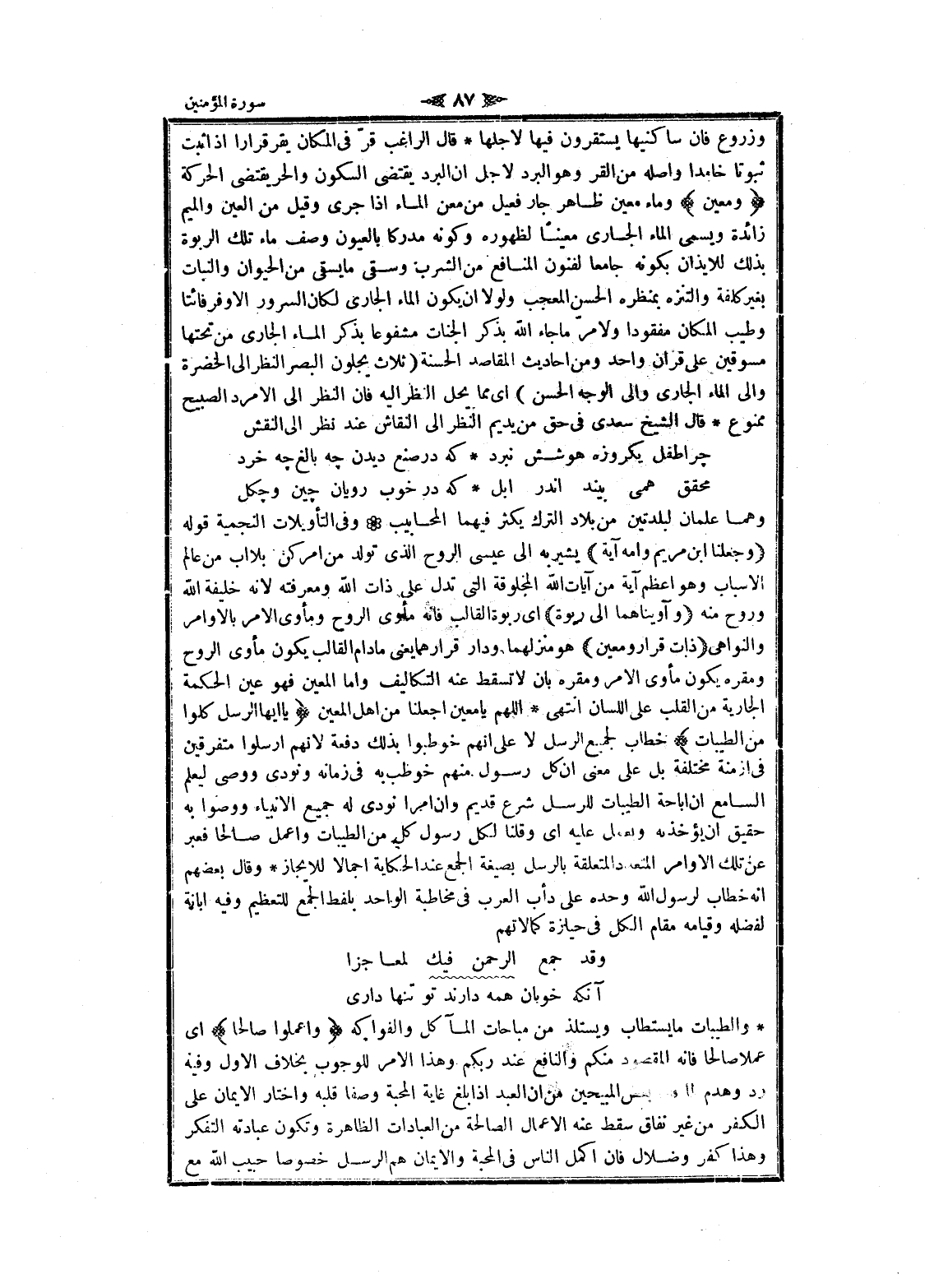 وهما علمان لبلدتين من بلاد الترك يكثر فيهما المحابيب وفى التأويلات النجمية قوله (وَجَعَلْنَا ابْنَ مَرْيَمَ وَأُمَّهُ آيَةً) يشير به الى عيسى الروح الذي تولد من امر كن بلا اب من عالم الأسباب وهو أعظم آية من آيات الله المخلوقة التي تدل على ذات الله ومعرفته لانه خليفة الله وروح منه (وَآوَيْناهُما إِلى رَبْوَةٍ) اى ربوة القالب فانه مأوى الروح ومأوى الأمر بالأوامر والنواهي (ذاتِ قَرارٍ وَمَعِينٍ) هو منزلهما ودار قرارهما يعنى مادام القالب يكون مأوى الروح ومقره يكون مأوى الأمر ومقره بان لا تسقط عنه التكاليف واما المعين فهو عين الحكمة الجارية من القلب على اللسان انتهى اللهم يا معين اجعلنا من اهل المعين يا أَيُّهَا الرُّسُلُ كُلُوا مِنَ الطَّيِّباتِ خطاب لجميع الرسل لا على انهم خوطبوا بذلك دفعة لانهم أرسلوا متفرقين فى ازمنة مختلفة بل على معنى ان كل رسول منهم خوطب به فى زمانه ونودى ووصى ليعلم السامع ان اباحة الطيبات للرسل شرع قديم وان امرا نودى له جميع الأنبياء ووصوا به حقيق ان يؤخذ به ويعمل عليه اى وقلنا لكل رسول كل من الطيبات واعمل صالحا فعبر عن تلك الأوامر المتعدد المتعلقة بالرسل بصيغة الجمع عند الحكاية اجمالا للايجاز وقال بعضهم انه خطاب لرسول الله وحده على دأب العرب فى مخاطبة الواحد بلفظ الجمع للتعظيم وفيه ابانة لفضله وقيامه مقام الكل فى حيازة كمالاتهم