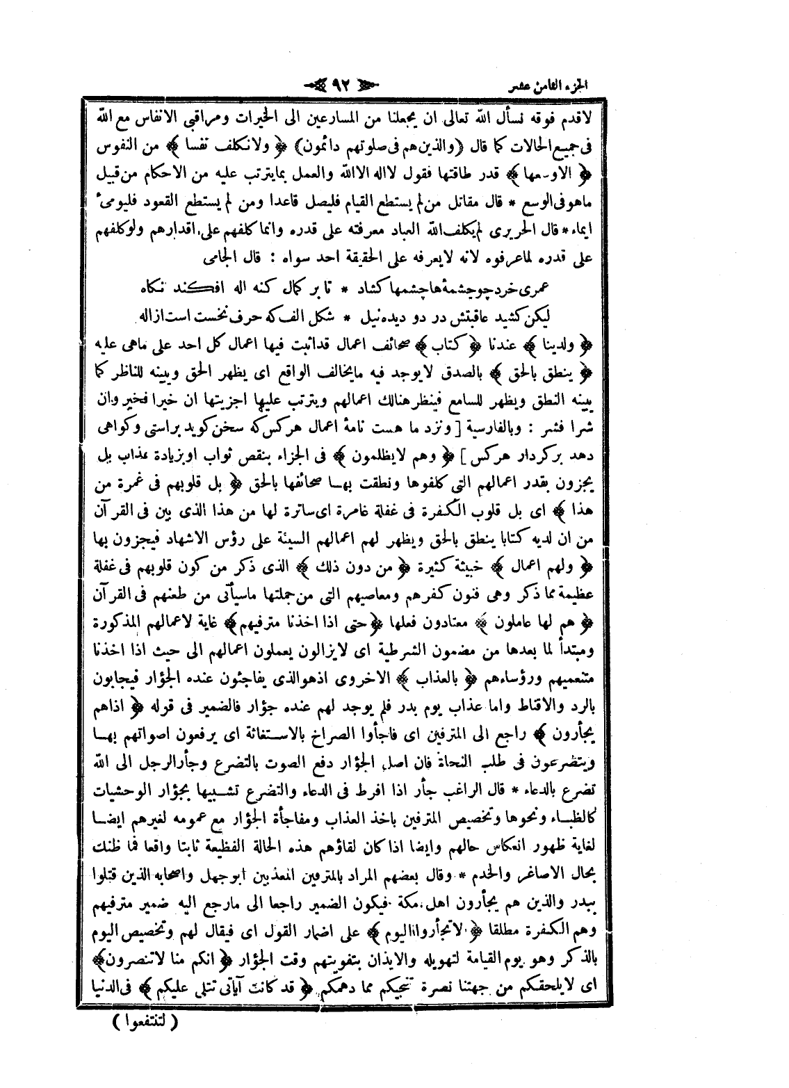 لا قدم فوقه نسأل الله تعالى ان يجعلنا من المسارعين الى الخيرات ومراقبى الأنفاس مع الله فى جميع الحالات كما قال (الَّذِينَ هُمْ عَلى صَلاتِهِمْ دائِمُونَ) وَلا نُكَلِّفُ نَفْساً) من النفوس إِلَّا وُسْعَها قدر طاقتها فقول لا اله الا الله والعمل بما يترتب عليه من الاحكام من قبيل ما هو فى الوسع قال مقاتل من لم يستطع القيام فليصل قاعدا ومن لم يستطع القعود فليومئ ايماء قال الحريري لم يكلف الله العباد معرفته على قذره وانما كلفهم على أقدارهم ولو كلفهم على قدره لما عرفوه لانه لا يعرفه على الحقيقة أحد سواه: قال الجامى