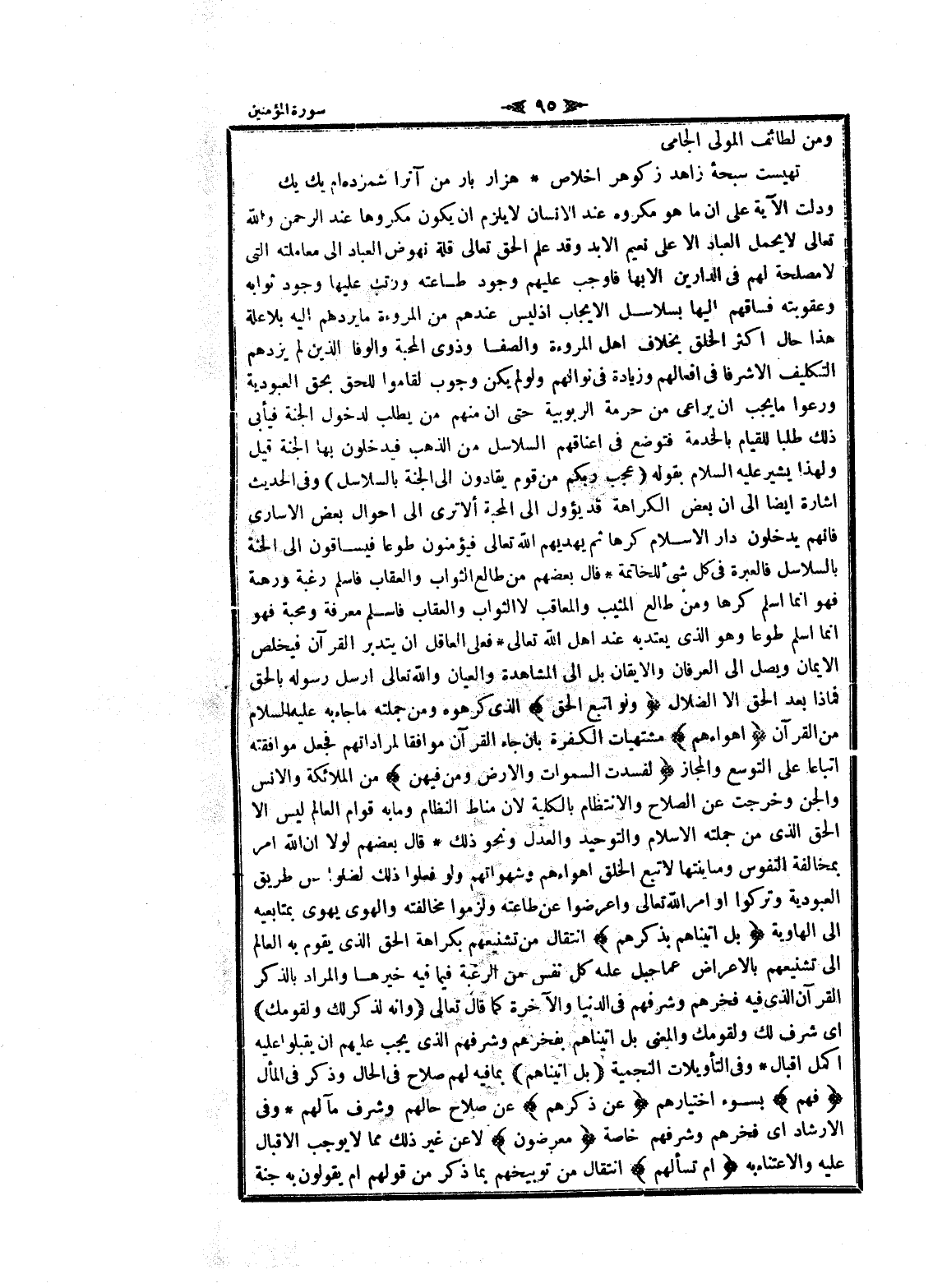 ودلت الآية على ان ما هو مكروه عند الإنسان لا يلزم ان يكون مكروها عند الرحمن والله تعالى لا يحمل العباد الا على نعيم الابد وقد علم الحق تعالى قلة نهوض العباد الى معاملته التي لا مصلحة لهم فى الدارين الا بها فاوجب عليهم وجود طاعته ورتب عليها وجود ثوابه وعقوبته فساقهم إليها بسلاسل الإيجاب إذ ليس عندهم من المروءة ما يردهم اليه بلا علة هذا حال اكثر الخلق بخلاف اهل المروءة والصفا وذوى المحبة والوفا الذين لم يزدهم التكليف الا شرفا فى أفعالهم وزيادة فى نوالهم ولو لم يكن وجوب لقاموا للحق بحق العبودية ورعوا ما يجب ان يراعى من حرمة الربوبية حتى ان منهم من يطلب لدخول الجنة فيأبى ذلك طلبا للقيام بالخدمة فتوضع فى أعناقهم السلاسل من الذهب فيدخلون بها الجنة قيل ولهذا يشير عليه السلام بقوله (عجب ربكم من قوم يقادون الى الجنة بالسلاسل) وفى الحديث اشارة ايضا الى ان بعض الكراهة قد يؤول الى المحبة ألا ترى الى احوال بعض الأسارى فانهم يدخلون دار الإسلام كرها ثم يهديهم الله تعالى فيؤمنون طوعا فيساقون الى الجنة بالسلاسل فالعبرة فى كل شىء للخاتمة فال بعضهم من طالع الثواب والعقاب فاسلم رغبة ورهبة فهو انما اسلم كرها ومن طالع المثيب والمعاقب لا الثواب والعقاب فاسلم معرفة ومحبة فهو انما اسلم طوعا وهو الذي يعتد به عند اهل الله تعالى فعلى العاقل ان يتدبر القرآن فيخلص الايمان ويصل الى العرفان والإيقان بل الى المشاهدة والعيان والله تعالى أرسل رسوله بالحق فماذا بعد الحق الا الضلال وَلَوِ اتَّبَعَ الْحَقُّ الذي كرهوه ومن جملته ما جاء به عليه السلام من القرآن أَهْواءَهُمْ مشتهيات الكفرة بان جاء القرآن موافقا لمرادتهم فجعل موافقته اتباعا على التوسع والمجاز لَفَسَدَتِ السَّماواتُ وَالْأَرْضُ وَمَنْ فِيهِنَّ من الملائكة والانس والجن وخرجت عن الصلاح والانتظام بالكلية لان مناط النظام وما به قوام العالم ليس الا الحق الذي من جملته الإسلام والتوحيد والعدل ونحو ذلك قال بعضهم لولا ان الله امر بمخالفة النفوس ومباينتها لاتبع الخلق أهواءهم وشهواتهم ولو فعلوا ذلك لضلوا عن طريق العبودية وتركوا او امر الله تعالى واعرضوا عن طاعته ولزموا مخالفته والهوى يهوى بمتابعيه الى الهاوية بَلْ أَتَيْناهُمْ بِذِكْرِهِمْ انتقال من تشنيعهم بكراهة الحق الذي يقوم به العالم الى تشنيعهم بالاعراض عما جبل عليه كل نفس من الرغبة فيما فيه خيرها والمراد بالذكر القرآن الذي فيه فخرهم وشرفهم فى الدنيا والآخرة كما قال تعالى (وَإِنَّهُ لَذِكْرٌ لَكَ وَلِقَوْمِكَ) اى شرف لك ولقومك والمعنى بل اتيناهم بفخرهم وشرفهم الذي يجب عليهم ان يقبلوا عليه أكمل اقبال وفى التأويلات النجمية (بَلْ أَتَيْناهُمْ) بما فيه لهم صلاح فى الحال وذكر فى المال فَهُمْ بسوء اختيارهم عَنْ ذِكْرِهِمْ عن صلاح حالهم وشرف مآلهم وفى الإرشاد اى فخرهم وشرفهم خاصة مُعْرِضُونَ لا عن غير ذلك مما لا يوجب الإقبال عليه والاعتناء به أَمْ تَسْأَلُهُمْ انتقال من توبيخهم بما ذكر من قولهم أم يقولون به جنة