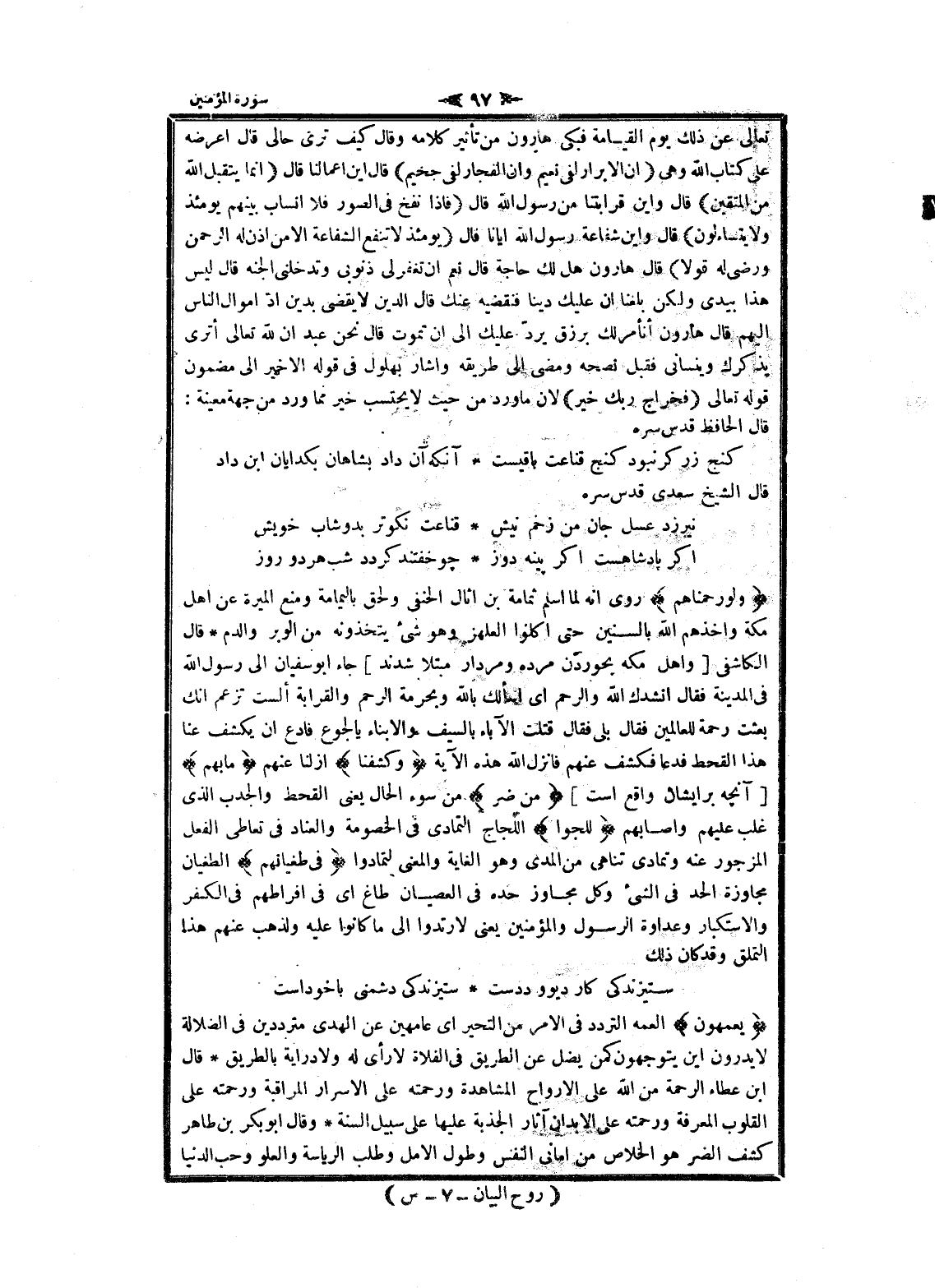 تعالى عن ذلك يوم القيامة فبكى هارون من تأثير كلامه وقال كيف ترى حالى قال اعرضه على كتاب الله وهى (إِنَّ الْأَبْرارَ لَفِي نَعِيمٍ وَإِنَّ الْفُجَّارَ لَفِي جَحِيمٍ) قال اين اعمالنا قال (إِنَّما يَتَقَبَّلُ اللَّهُ مِنَ الْمُتَّقِينَ) قال واين قرابتنا من رسول الله قال (فَإِذا نُفِخَ فِي الصُّورِ فَلا أَنْسابَ بَيْنَهُمْ يَوْمَئِذٍ وَلا يَتَساءَلُونَ) قال واين شفاعة رسول الله إيانا قال (يَوْمَئِذٍ لا تَنْفَعُ الشَّفاعَةُ إِلَّا مَنْ أَذِنَ لَهُ الرَّحْمنُ وَرَضِيَ لَهُ قَوْلًا) قال هارون هل لك حاجة قال نعم ان تغفر لى ذنوبى وتدخلنى الجنة قال ليس هذا بيدي ولكن بلغنا ان عليك دينا فنقضيه عنك قال الدين لا يقضى بدين ادّ اموال الناس إليهم قال هارون أنأمر لك برزق يردّ عليك الى ان تموت قال نحن عبد ان لله تعالى أترى يذكرك وينسانى فقبل نصحه ومضى الى طريقه وأشار بهلول فى قوله الأخير الى مضمون قوله تعالى (فَخَراجُ رَبِّكَ خَيْرٌ) لان ما ورد من حيث لا يحتسب خير مما ورد من جهة معينة:
