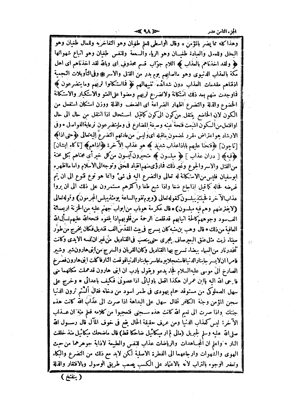 وهذا كله مما يضر بالمؤمن وقال الواسطي للعلم طغيان وهو التفاخر به وللمال طغيان وهو البخل وللعمل والعبادة طغيان وهو الرياء والسمعة وللنفس طغيان وهو اتباع شهواتها وَلَقَدْ أَخَذْناهُمْ بِالْعَذابِ اللام جواب قسم محذوف اى وبالله لقد أخذناهم اى اهل مكة بالعذاب الدنيوي وهو ما أصابهم يوم بدر من القتل والاسر وفى التأويلات النجمية اذقناهم مقدمات العذاب دون شدائده تنبيها لهم فَمَا اسْتَكانُوا لِرَبِّهِمْ وَما يَتَضَرَّعُونَ فما وجدت منهم بعد ذلك استكانة ولا تضرع لربهم ومضوا على العتو والاستكبار والاستكانة الخضوع والذلة والتضرع اظهار الضراعة اى الضعف والذلة ووزن استكان استفعل من الكون لان الخاضع ينتقل من كون الى كون كما قيل استحال إذا انتقل من حال الى حال او افتعل من السكون أشبعت فتحة عينه وصيغة المضارع فى وما يتضرعون لرعاية الفواصل وفى الإرشاد هو اعتراض مقرر لمضمون ما قبله اى وليس من عادتهم التضرع اليه تعالى حَتَّى إِذا [تا چون] فَتَحْنا عَلَيْهِمْ باباً ذا عَذابٍ شَدِيدٍ هو عذاب الآخرة إِذا هُمْ [ناكاه ايشان] فِيهِ [دران عذاب] مُبْلِسُونَ متحيرون آيسون من كل خير أي محناهم بكل محنة من القتل والاسر والجوع وغير ذلك فما رؤى منهم انقياد للحق وتوجه الى الإسلام واما ما أظهره ابو سفيان فليس من الاستكانة له تعالى والتضرع اليه فى شىء وانما هو نوع قنوع الى ان يتم غرضه فحاله كما قيل إذا جاع ضغا وإذا شبع طغا وأكثرهم مستمرون على ذلك الى ان يروا عذاب الآخرة فحينئذ يبلسون كقوله تعالى (وَيَوْمَ تَقُومُ السَّاعَةُ يُبْلِسُ الْمُجْرِمُونَ) وقوله تعالى (لا يُفَتَّرُ عَنْهُمْ وَهُمْ فِيهِ مُبْلِسُونَ) قال عكرمة هو باب من أبواب جهنم عليه من الخزنة اربعمائة الف سود وجوههم كالحة أنيابهم قد قلعت الرحمة من قلوبهم إذا بلغوه فتحه الله عليهم نسأل الله العافية من ذلك قال وهب بن منبه كان يسرج فى بيت المقدس الف قنديل فكان يخرج من طور سيناء زيت مثل عنق البعير صاف يجرى حتى ينصب فى القناديل من غير ان تمسه الأيدي وكانت تنحدر نار من السماء بيضاء تسرج بها القناديل وكان القربان والسرج من ابني هارون شبر وشبير فامرا ان لا يسرجا بنار الدنيا فاستعجلا يوما فاسرجا بنار الدنيا فوقعت النار فاكلت ابني هارون فصرخ الصارخ الى موسى عليه السلام فجاء يدعو ويقول يا رب ان ابني هارون قد عملت مكانهما منى فاوحى الله اليه يا ابن عمران هكذا افعل باوليائى إذا عصونى فكيف باعدائى وخرج على سهل الصعلوكي من مستوقد حمام يهودى فى طمر اسود من دخانه فقال ألستم ترون الدنيا سجن المؤمن وجنة الكافر فقال سهل على البداهة إذا صرت الى عذاب الله كانت هذه جنتك وإذا صرت الى نعيم الله كانت هذه سجنى فتعجبوا من كلامه فعلم منه ان عذاب الآخرة ليس كعذاب الدنيا ومن عرف حقيقة الحال يقع فى خوف المآل قال رسول الله صلى الله عليه وسلم لجبريل (ما لى لم ار ميكائيل ضاحكا قط) قال ما ضحك ميكائيل منذ خلقت النار واعلم ان المجاهدات والرياضات عذاب للنفس والطبيعة لاذابة جوهرهما من حيث الهوى والشهوات وإرجاعهما الى الفطرة الاصلية لكن لا بد مع ذلك من التضرع والبكاء وتعفير الوجوه بالتراب لانه بالاعتماد على الكسب يصعب طريق الوصول وبالافتقار والذلة