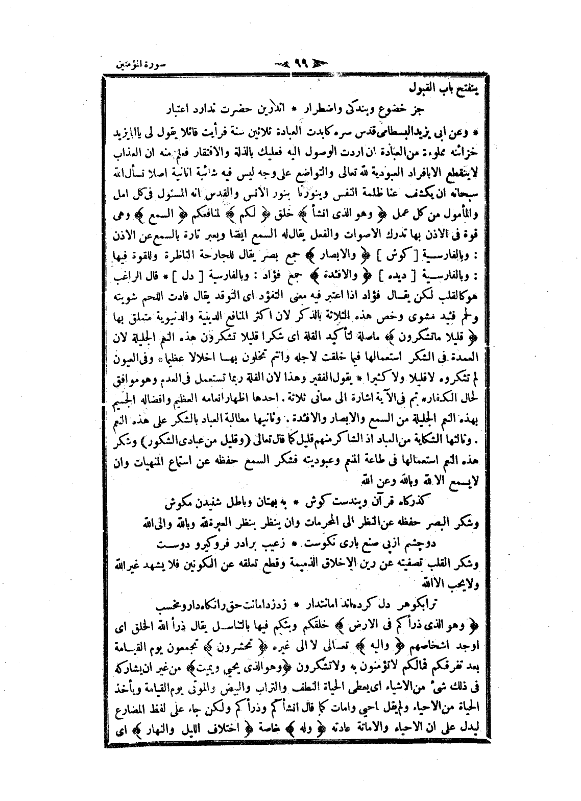 وعن ابى يزيد البسطامي قدس سره كابدت العبادة ثلاثين سنة فرأيت قائلا يقول لى يا أبا يزيد خزائنه مملوءة من العبادة ان أردت الوصول اليه فعليك بالذلة والافتقار فعلم منه ان العذاب لا ينقطع الا بافراد العبودية لله تعالى والتواضع على وجه ليس فيه شائبة انانية أصلا نسأل الله سبحانه ان يكشف عنا ظلمة النفس وينورنا بنور الانس والقدس انه المسئول فى كل امل والمأمول من كل عمل وَهُوَ الَّذِي أَنْشَأَ خلق لَكُمُ لمنافعكم السَّمْعَ وهى قوة فى الاذن بها تدرك الأصوات والفعل يقال له السمع ايضا ويعبر تارة بالسمع عن الاذن: وبالفارسية [كوش] وَالْأَبْصارَ جمع بصر يقال للجارحة الناظرة وللقوة فيها: وبالفارسية [ديده] وَالْأَفْئِدَةَ جمع فؤاد: وبالفارسية [دل] قال الراغب هو كالقلب لكن يقال فؤاد إذا اعتبر فيه معنى التفؤد اى التوقد يقال فادت اللحم شويته ولحم فئيد مشوى وخص هذه الثلاثة بالذكر لان اكثر المنافع الدينية والدنيوية متعلق بها قَلِيلًا ما تَشْكُرُونَ ما صلة لتأكيد القلة اى شكرا قليلا تشكرون هذه النعم الجليلة لان العمدة فى الشكر استعمالها فيما خلقت لاجله وأنتم تخلون بها اخلالا عظيما وفى العيون لم تشكروه لا قليلا ولا كثيرا يقول الفقير وهذا لان القلة ربما تستعمل فى العدم وهو موافق لحال الكفار ثم فى الآية اشارة الى معانى ثلاثة. أحدها اظهار انعامه العظيم وافضاله الجسيم بهذه النعم الجليلة من السمع والابصار والافئدة. وثانيها مطالبة العباد بالشكر على هذه النعم. وثالثها الشكاية من العباد إذ الشاكر منهم قليل كما قال تعالى (وَقَلِيلٌ مِنْ عِبادِيَ الشَّكُورُ) وشكر هذه النعم استعمالها فى طاعة المنعم وعبوديته فشكر السمع حفظه عن استماع المنهيات وان لا يسمع الا لله وبالله وعن الله