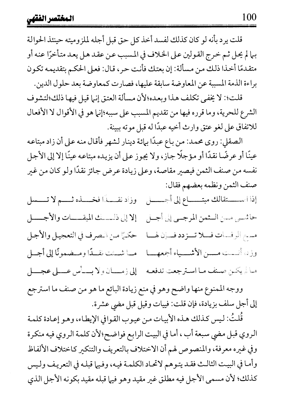 قُلتُ: ليس كذلك هذه الأبيات من عيوب القوافي الإيطاء، وهو إعادة كلمة الروي قبل مضي سبعة أب، أما في البيت الرابع فواضح؛ لأن كلمة الروي فيه منكرة وفي غيره معرفة، والمنصوص لهم أن الاختلاف بالتعريف والتنكير كاختلاف الألفاظ وأما في البيت الثالث فقد يتوهم لاتحاد الكلمة فيه، وفيما قبله في التعريف وليس كذلك؛ لأن مسمى الأجل فيه مطلق غير مقيد وهو فيما قبله مقيد بكونه الأجل الذي