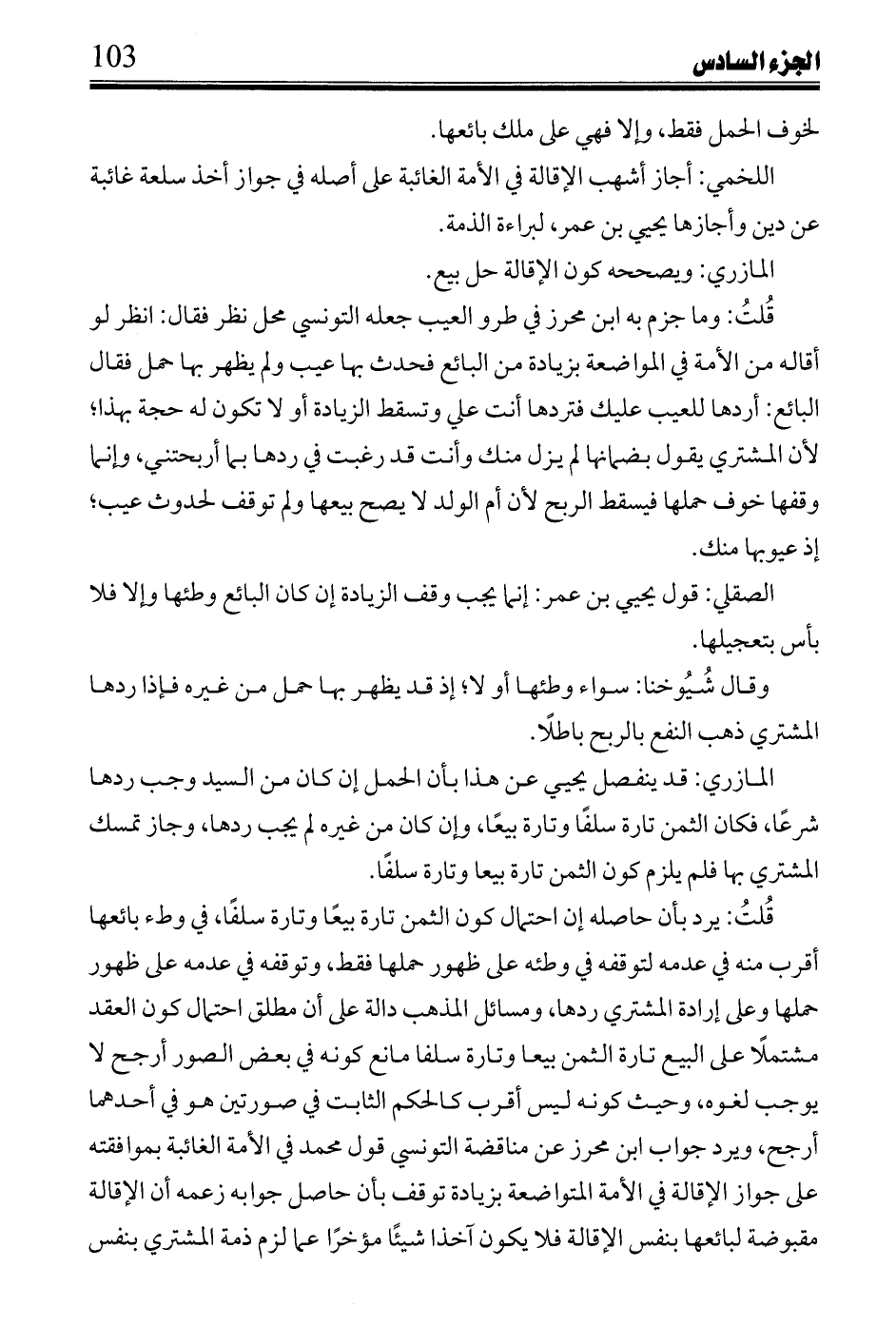 قُلتُ: وما جزم به ابن محرز في طرو العيب جعله التونسي محل نظر فقال: انظر لو أقاله من الأمة في المواضعة بزيادة من البائع فحدث بها عيب ولم يظهر بها حمل فقال البائع: أردها للعيب عليك فتردها أنت علي وتسقط الزيادة أو لا تكون له حجة بهذا؛ لأن المشتري يقول بضمانها لم يزل منك وأنت قد رغبت في ردها بما أربحتني، وإنما وقفها خوف حملها فيسقط الربح لأن أن الولد لا يصح بيعها ولم توقف لحدوث عيب؛ إذ عيوبها منك.