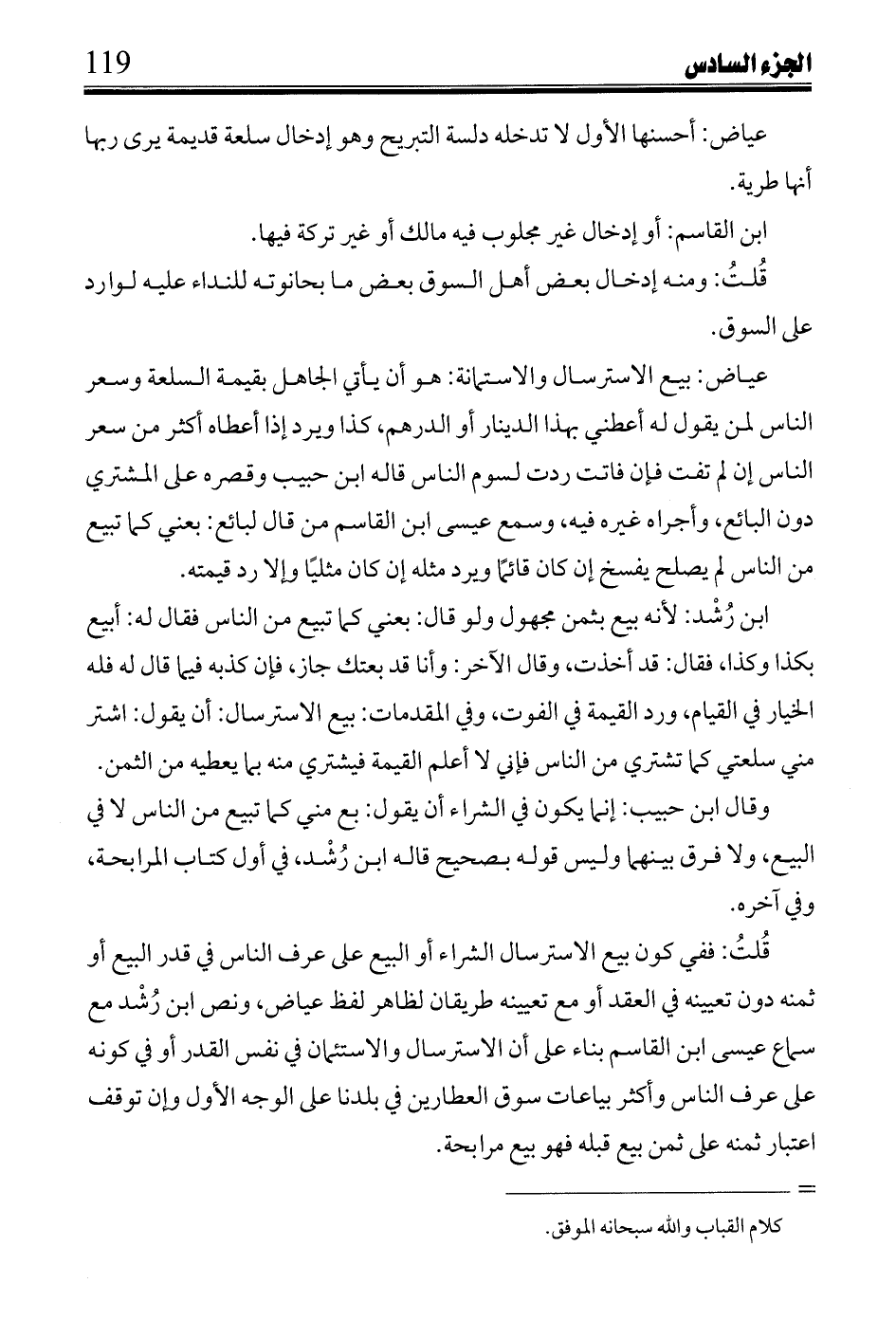 قلت: ففي كون بيع الاسترسال الشراء أو البيع على عرف الناس في قدر البيع أو ثمنه دون تعيينه في العقد أو مع تعيينه طريقان لظاهر لفظ عياض، ونص ابن رشد مع سماع عيسى ابن القاسم بناء على أن الاسترسال والاستئمان في نفس القدر أو في كونه على عرف الناس وأكثر بياعات سوق العطارين في بلدنا على الوجه الأول وإن توقف اعتبار ثمنه على ثمن بيع قبله فهو بيع مرابحة.