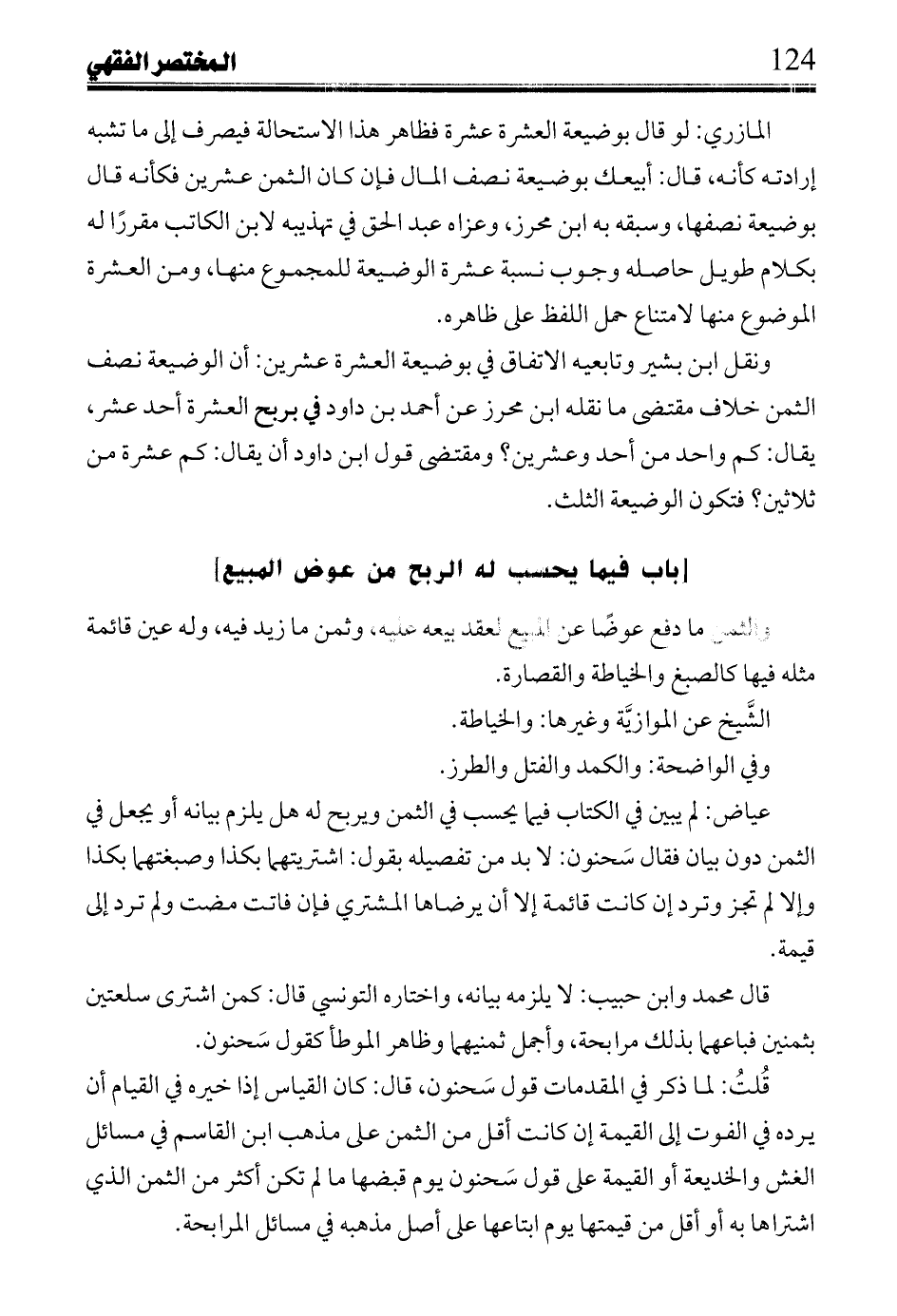 المازري: لو قال بوضيعة العشرة عشرة فظاهر هذا الاستحالة فيصرف إلى ما تشبه إرادته كأنه، قال: أبيعك بوضيعة نصف المال فإن كان الثمن عشرين فكأنه قال بوضيعة نصفها، وسبقه به ابن محرز، وعزاه عبد الحق في تهذيبه لابن الكاتب مقررًا له بكلام طويل حاصله وجوب نسبة عشرة الوضيعة للمجموع منها، ومن العشرة الموضوع منها لامتناع حمل اللفظ على ظاهره.