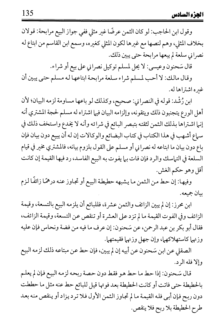 وقول ابن الحاجب: لو كان الثمن عرضًا غير مثلي ففي جواز البيع مرابحة: قولان بخلاف المثلي، وهم لنصها مع غيرها لكون المثلي كغيره، وسمع ابن القاسم من ابتاع له نصراني سلعة لم يبعها مرابحة حتى يبين ذلك.