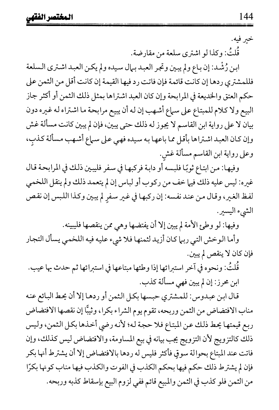 ابن رشد: إن باع ولم يبين وتجر العبد بما لسيده ولم يكن العبد اشترى السلعة فللمشتري ردها إن كانت قائمة فإن فاتت رد فيها القيمة إن كانت أقل من الثمن على حكم العتق والخديعة في المرابحة وإن كان العبد اشتراها بمثل ذلك الثمن أو أكثر جاز البيع ولا كلام للمبتاع على سماع أشهب إن له أن يبيع مرابحة ما اشتراه له غيره دون بيان لا على رواية ابن القاسم لا يجوز له ذلك حتى يبين، فإن لم يبين كانت مسألة غش وإن كان العبد اشتراها بأقل مما باعها به سيده فهي على سماع أشهب مسألة كذب، وعلى رواية ابن القاسم مسألة غش.