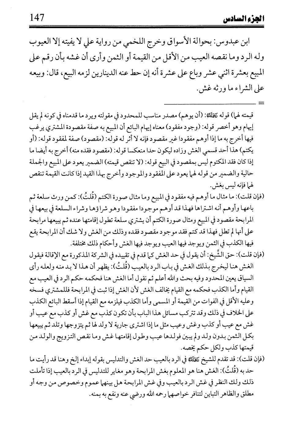 ابن عبدوس: بحوالة الأسواق وخرج اللخمي من رواية علي لا يفيته إلا العيوب وله الرد وما نقصه العيب من الأقل من القيمة أو الثمن وأرى أن غشه بأن رقم على المبيع بعشرة اثني عشر وباع على عشرة أنه إن حط عنه الدينارين لزمه البيع، قال: وبيعه على الشراء ما ورثه غش.