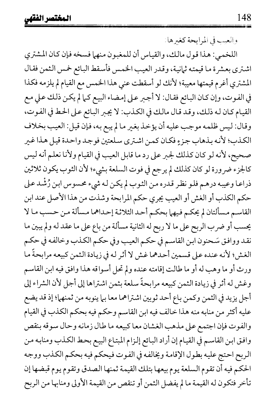 اللخمي: هذا قول مالك، والقياس أن للمغبون منهما فسخه فإن كان المشتري اشترى بعشرة ما قيمته ثمانية، وقدر العيب الخمس فأسقط البائع خمس الثمن فقال المشتري أغرم قيمتها معيبة؛ لأنك لو أسقطت عني هذا الخمس مع القيام لم يلزمه فكذا في الفوت، وإن كان البائع فقال: لا أجبر على إمضاء البيع كما لم كن ذلك علي مع القيام كان له ذلك، وقد قال مالك في الكذب: لا يجبر البائع على الحط في الفوت، وقال: ليس ظلمه موجب عليه أن يؤخذ بغير ما لم يبع به، فإن قيل: العيب بخلاف الكذب؛ لأنه بذهاب جزءٍ فكان فكان كمن اشترى سلعتين فوجد واحدة قيل هذا غير صحيح، لأنه لو كان كذلك لجبر على رد ما قابل العيب في القيام ولأنا نعلم أنه ليس كالجزء ضرورة لو كان كذلك لم يرجع في فوت السلعة بشيء؛ لأن الثوب يكون ثلاثين ذراعا وعيبه درهم فلو نظر قدره من الثوب لم يكن له شيء محسوس ابن رشد على حكم الكذب أو الغش أو العيب يجري حكم المرابحة وشذت من هذا الأصل عند ابن القاسم مسألتان لم يحكم فيهما بحكم أحد الثلاثة إحداهما مسألة من حسب ما لا يحسب أو ضرب الربح على ما لا ربح له الثانية مسألة من باع على ما عقد له ولم يبين ما نقد ووافق سحنون ابن القاسم في حكم العيب وفي حكم الكذب وخالفه في حكم الغش؛ لأنه عنده على قسمين أحدهما غش لا أثر له في زيادة الثمن كبيعه مرابحة ما ورث أو ما وهب له أو ما طالت إقامته عنده ولم تحل أسواقه هذا وافق فيه ابن القاسم وغش له أثر في زيادة الثمن كبيعة مرابحة سلعة بثمن اشتراها إلى أجل لأن الشراء إلى أجل يزيد في الثمن وكمن باع أحد ثوبين اشتراهما معا بما ينوبه من ثمنهما؛ إذ قد يضع عليه أكثر من منابه منه هذا خالف فيه ابن القاسم وحكم فيه بحكم الكذب في القيام والفوت فإن اجتمع على مذهب الغشان معا كبيعه ما طال زمانه وحال سوقه بنقص وافق ابن القاسم في القيام إن أراد البائع إلزام المبتاع البيع بحط الكذب ومنابه من الربح احتج عليه بطول الإقامة ويخالفه في الفوت فيحكم فيه بحكم الكذب ووجه الحكم فيه أن تقوم السلعة يوم بيعها بتلك القيمة ثمنها الصدق وتقوم يوم قبضها إن تأخر فتكون له القيمة ما لم يفضل الثمن أو تنقص من القيمة الأولى ومنابها من الربح