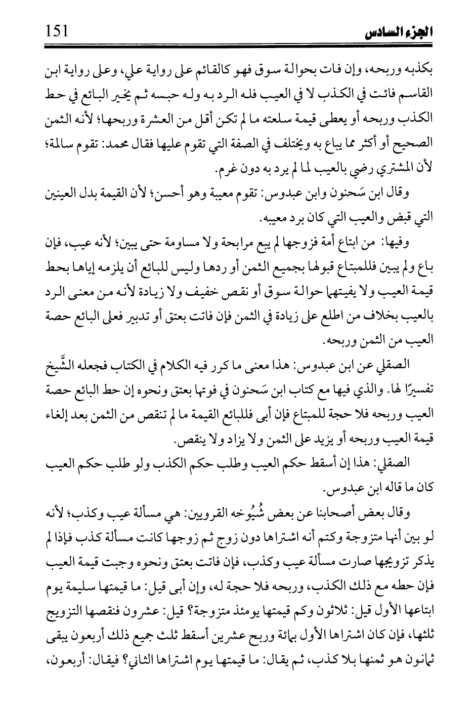الصفلي عن ابن عبدوس: ها معنى ما كرر فيه الكلام في الكتاب فجعله الشيَّخ تفسيرًا لها. والذي فيها مع كتاب ابن سَحنون في فوتها بعتق ونحوه إن حط البائع حصة العيب وربحه فلا حجة للمبتاع فإن أبى فلبائع القيمة ما لم تنقص من الثمن بعد إلغاء قيمة العيب وربحه أو يزيد على الثمن ولا يزاد ولا ينقص.