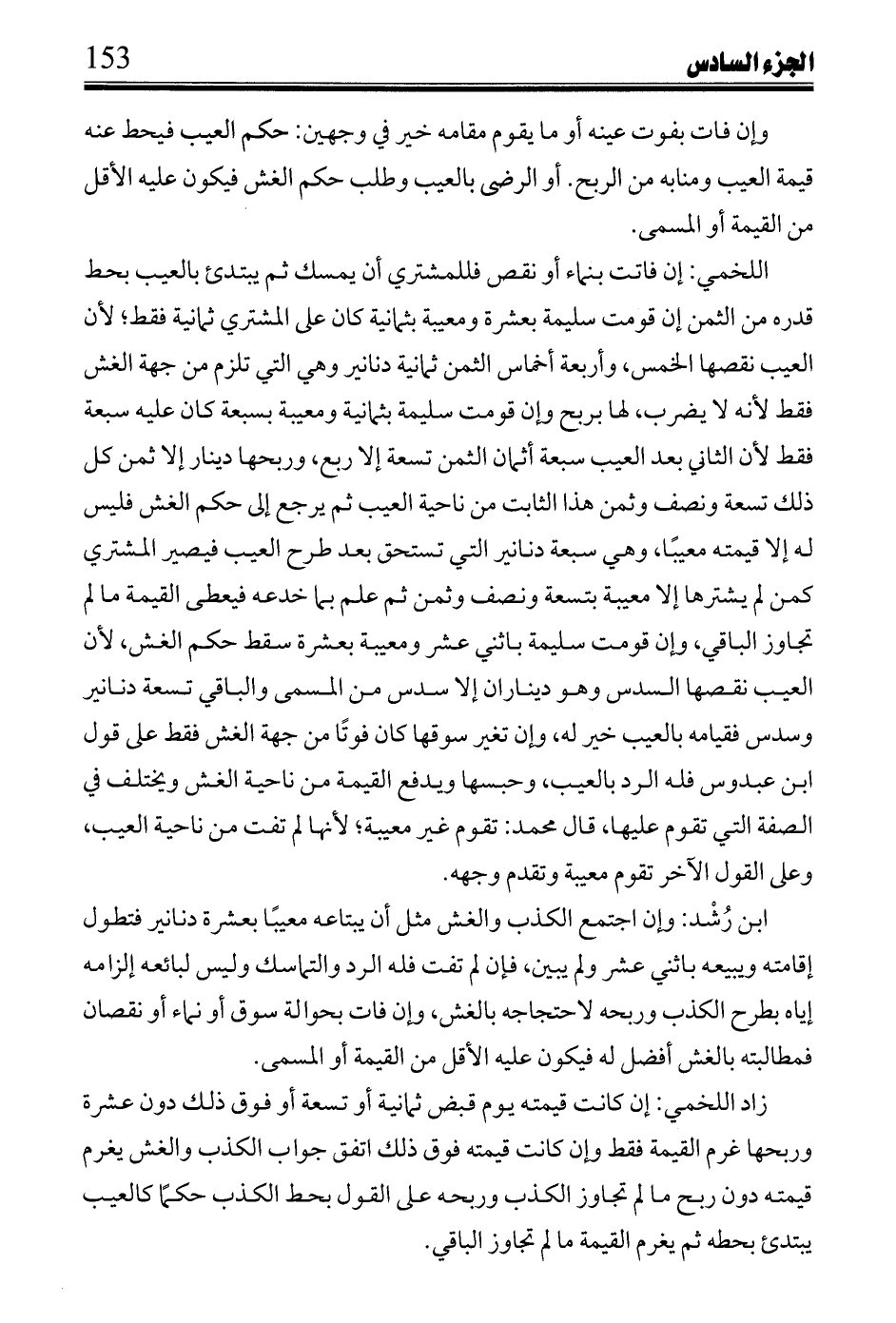ابن رُشْد: وإن اجتمع الكذب والغش مثل أن يبتاعه معيبًا بعشرة دنانير فتطول إقامته ويبيعه باثني عشر ولم يبين، فإن لم تفت فله الرد والتماسك وليس لبائعه إلزامه إياه بطرح الكب وربحه لاحتجاجه بالغش، وإن فات بحوالة سوق أو نماء أو نقصان فمطالبته بالغش أفضل له فيكون عليه الأقل من القيمة أو المسمى.
