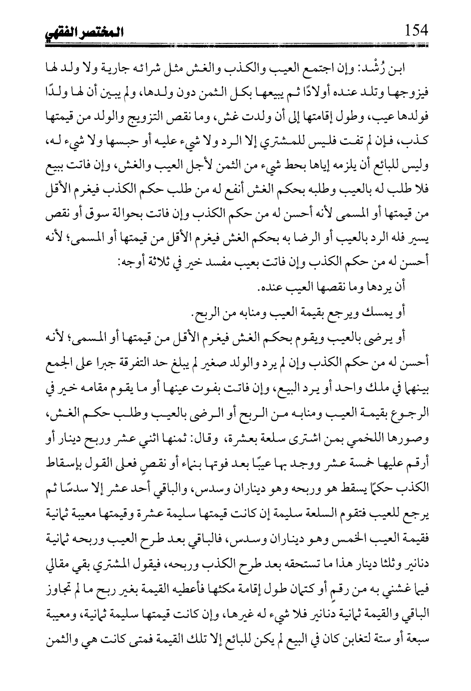 ابن رُشْد: وإن اجتمع العيب والكذب والغش مثل شرائه جارية ولا ولد لها فيزوجها وتلد عنده أولادًا ثم يبيعها بكل الثمن دون ولدها، ولم يبين أن لها ولدًا فولدها عيب، وطول إقامتها إلى أن ولدت غش، وما نقص التزويج والولد من قيمتها كذب، فإن لم تفت فليس للمشتري إلا الرد ولا شيء عليه أو حبسها ولا شيء له، وليس للبائع أن يلزمه إياها بحط شيء من الثمن لأجل العيب والغش، وإن فاتت ببيع فلا طلب له بالعيب وطلبه بحكم الغش أنفع له من طلب حكم الكب وإن فاتت بحوالة سوق أو نقص يسير فله الرد بالعيب أو الرضا به بحكم الغش فيغرم الأقل من قيمتها أو المسمى؛ لأنه أحسن له من حكم الكذب وإن فاتت بعيب مفسد خير في ثلاثة أوجه: