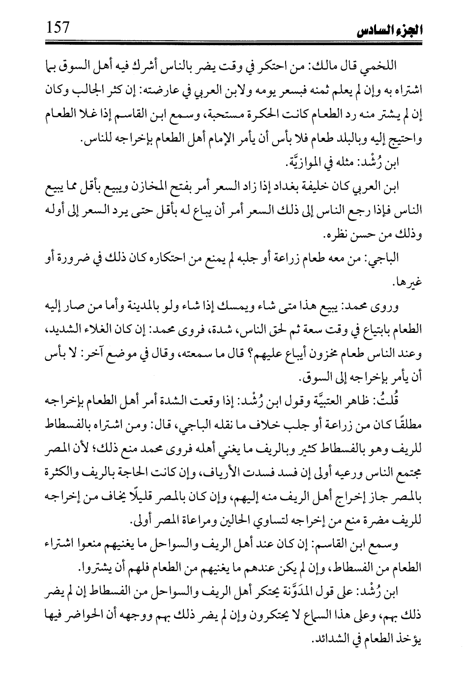 ابن رُشْد: على قول المدَوَّنة يحتكر أهل الريف والسواحل من الفسطاط إن لم يضر ذلك بهم، وعلى هذا السماع لا يحتكرون وإن لم يضر ذلك بهم ووجهه أن الحواضر فيها يؤخذ الطعام في الشدائد.