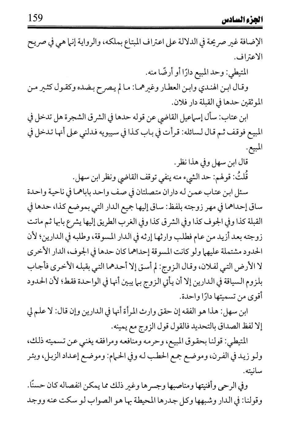 سئل ابن عتاب عمن له داران متصلتان في صف واحد باباهما في ناحية واحدة ساق إحداهما في مهر زوجته بلفظ: ساق إليها جميع الدار التي بموضع كذا، حدها في القبلة كذا وفي الجوف كذا وفي الشرق كذا وفي الغرب الطريق إليها يشرع بابها ثم ماتت زوجته بعد أن أزيد من عام فطلب وارثها إرثه في الدار المسوقة، وطلبه في الدارين؛ لأن الحدود مشتملة عليهما ولو كانت المسوقة إحداهما كان حدها في الجوف، الدار الأخرى لا الأرض التي لفلان، وقال الزوج: لم أسق إلا أحدهما التي بقبله الأخرى فأجاب بلزوم السياقة في الدارين إلا أن يأتي الزوج بما يبين أنها في الواحدة فقط؛ لأن الحدود أقوى من تسميتها دارًا واحدة.