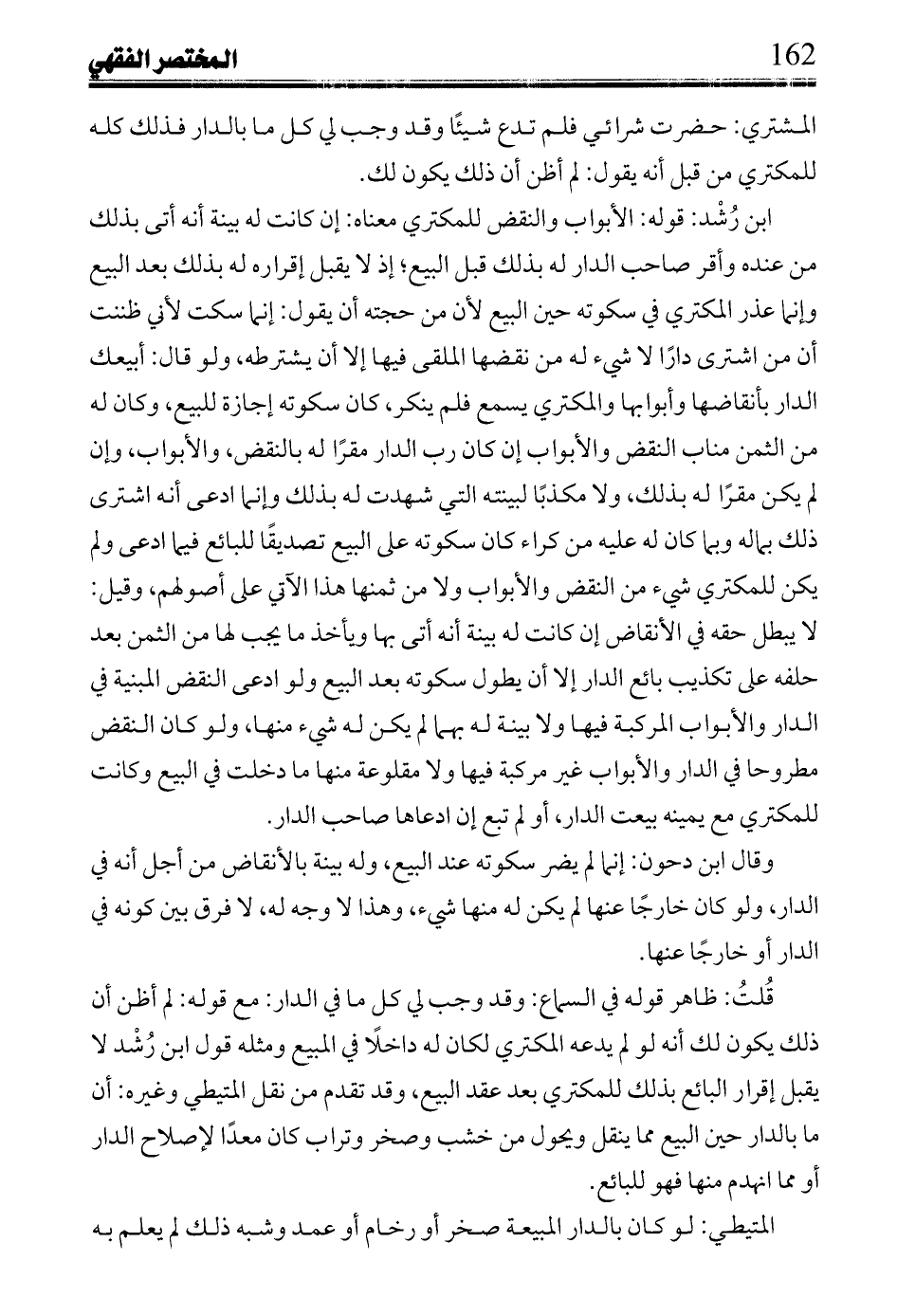 ابن رُشْد: قوله: ألأبواب والنقض للمكتري معناه: إن كانت له بينة أنه أتى بذلك من عنده وأقر صاحب الدار له بذلك قبل البيع؛ إذ لا يقبل إقراره له بذلك بعد البيع وإنما عذر المكتري في سكوته حين البيع لأن من حجته أن يقول: إنما سكت لأني ظننت أن من اشترى دارًا لا شيء له من نقضها الملقي فيها إلا أن يشترطه، ولو قال: أبيعك الدار بأنقاضها وأبوابها والمكتري يسمع فلم ينكر، كان سكوته إجازة للبيع، وكان له من الثمن مناب النقض والأبواب إن كان رب الدار مقرًا له بالنقض، والأبواب، وإن لم يكن مقرًا له بذلك، ولا مكذبًا لبينته التي شهدت له بذلك وإنما ادعى أنه اشترى ذلك بماله وبما كان له عليه من كراء كان سكوته على البيع تصديقًا للبائع فيما ادعى ولم يكن للمكتري شيء من النقض والأبواب ولا من ثمنها هذا الآتي على أصولهم وقيل: لا يبطل حقه في الأنقضاض إن كانت له بينة أنه أتى بها ويأخذ ما يجب لها من الثمن بعد حلفه على تكذيب بائع الدار إلا أن يطول سكوته بعد البيع ولو ادعى النقض المبينة في الدار والأبواب المركبة فيها ولا بينة له بهما لم يكن له شيء منها، ولو كان النقض مطروحا في الدار والأبواب غير مركبة فيها ولا مقلوعة منها ما دخلت في البيع وكانت للمكتري مع يمينه بيعت الدار، أو لم تبع إن ادعاها صاحب الدار.