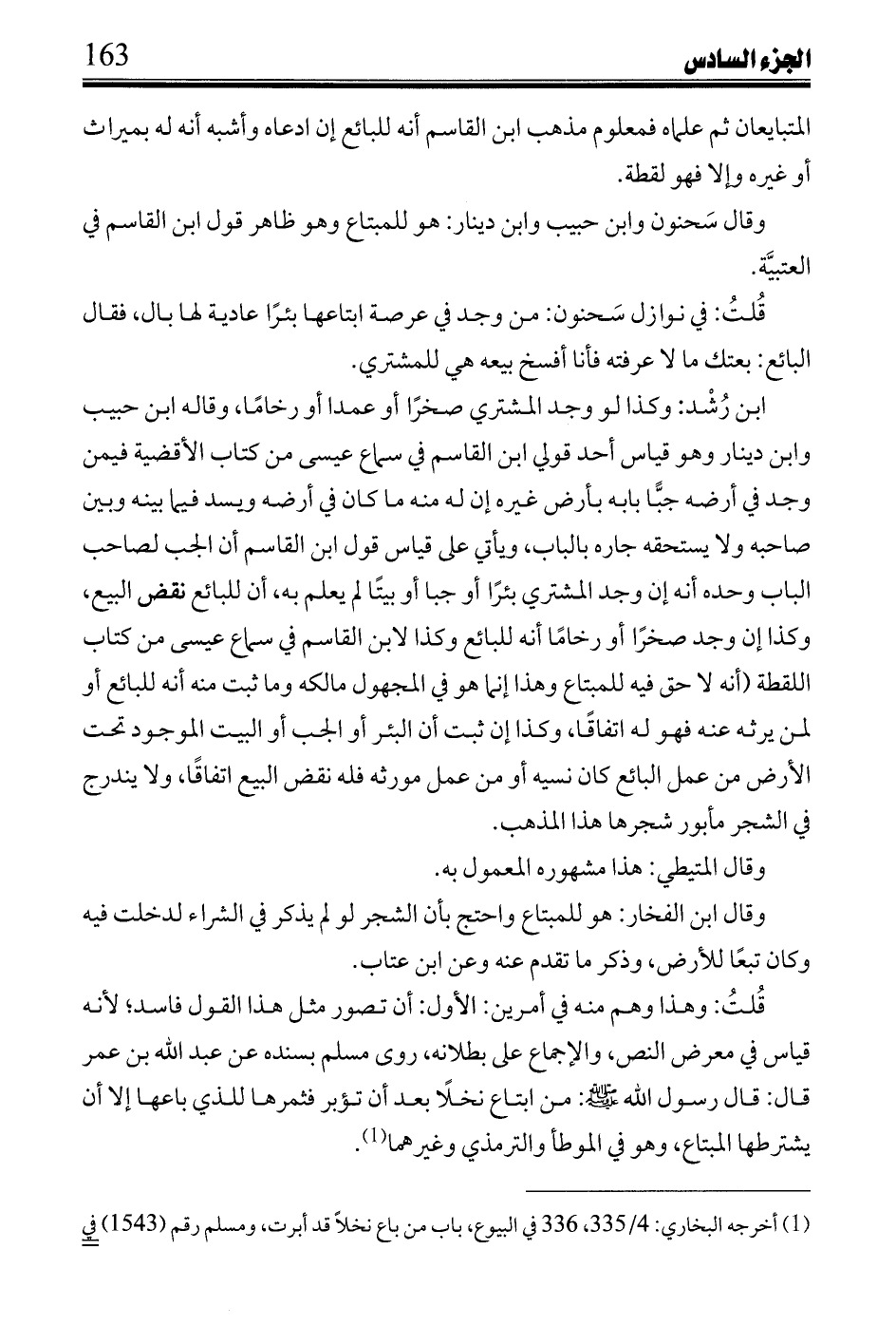 قُلتُ: وهذا وهم منه في أمرين: الأول: أن تصور مثل هذا القول فاسد؛ لأنه قياس في معرض النص، والإجماع على بطلانه، روى مسلم بسنده عن عبد الله بن عمر قال: قال رسول الله صلى الله عليه وسلم: من ابتاع نخلاً بعد أن تؤير فثمرها للذي باعها إلا أن يشترطها المبتاع، وهو في الموطأ والترمذي وغيرهما.