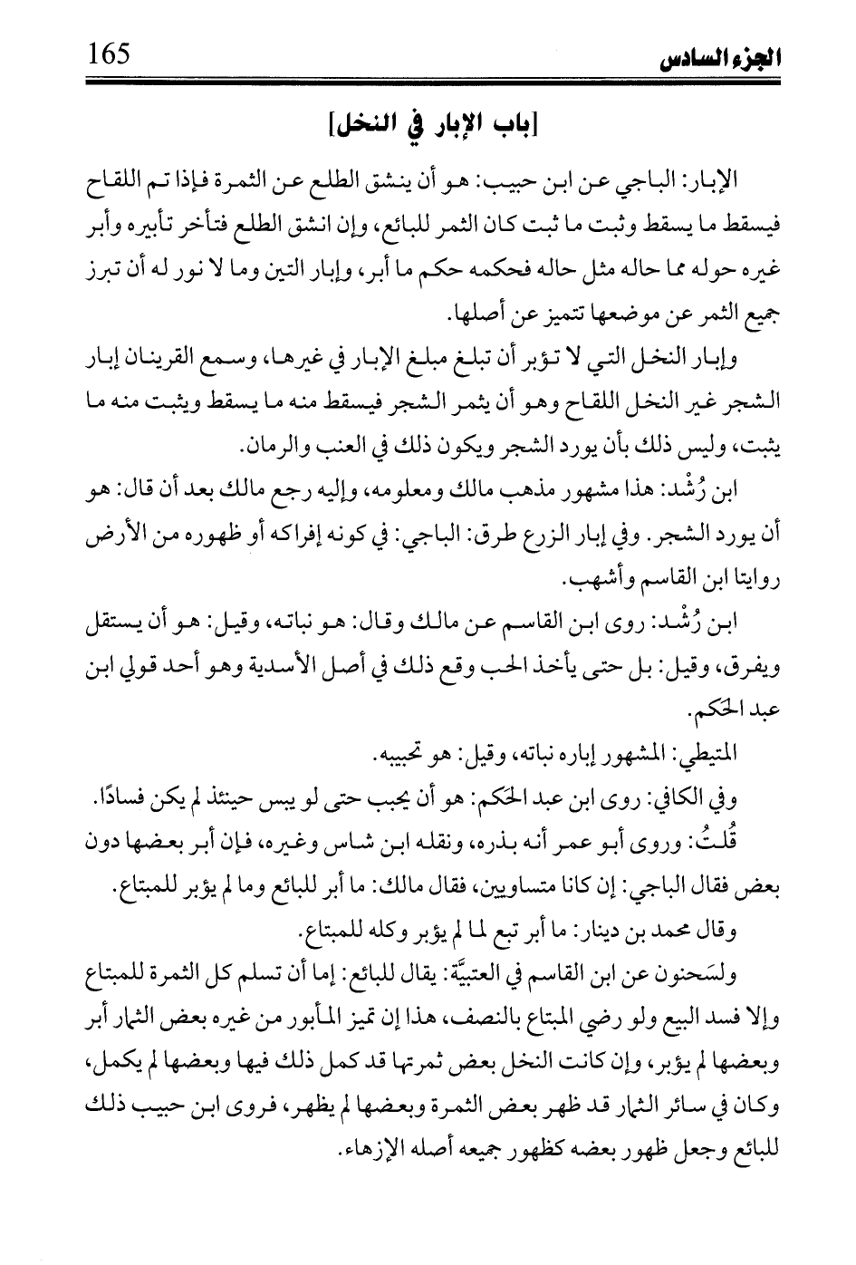 ابن رُشْد: هذا مشهور مذهب مالك ومعلومه، وإليه رجع مالك بعد أن قال: هو أن يورد الشجر. وفي إبار الزرع طرق: الباجي: في كونه إفراكه أو ظهوره من الأرض روايتا ابن القاسم وأشهب.