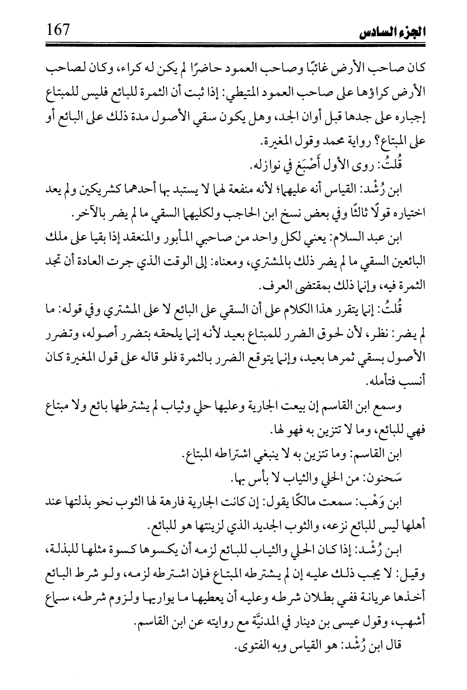 ابن عبد السلام: يعني لكل واحد من صاحبي المأبور والمنعقد إذا بقيا على ملك البائعين السقي ما لم يضر ذلك بالمشتري، ومعناه: إلى الوقت الذي جرت العادة أن تجد الثمرة فيه، وإنما ذلك بمقتضى العرف.