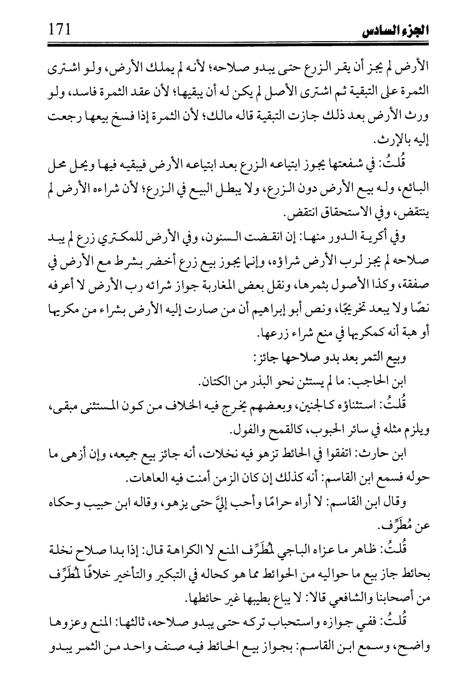 قُلتُ: ظاهر ما عزاه الباجي لمُطَرِّف المنع لا الكراهة قال: إذا بدا صلاح نخلة بحائط جاز بيع ما حواليه من الحوائط مما هو كحاله في التبكير والتأخير خلافًا لمُطَرِّف من أصحابنا والشافعي قالا: لا يباع بطيبها غير حائطها.