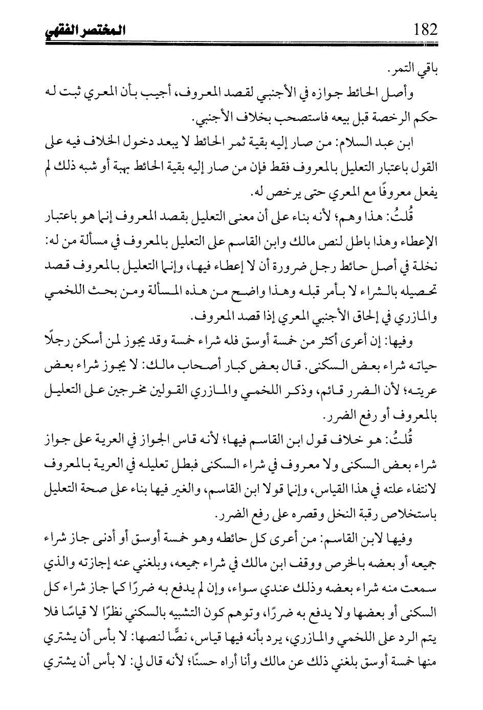 ابن عبد السلام: من صار إليه بقية ثمر الحائط لا يبعد دخول الخلاف فيه على القول باعتبار التعليل بالمعروف فقط فإن من صار إليه بقية الحائط بهبة أو شبه ذلك لم يفعل معروفاً مع المعري حتى يرخص له.