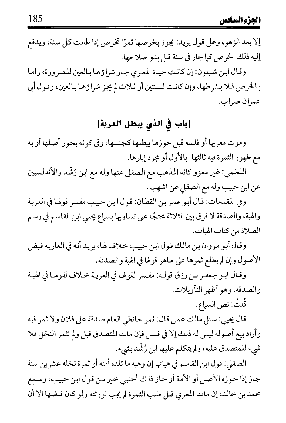 وفي المقدمات: قال أبو عمر بن القطان: قول ابن حبيب مفسر قولها في العرية والهبة، والصدقة لا فرق بين الثلاثة محتجاً على تساويها بسماع يحيى ابن القاسم في رسم الصلاة من كتاب الهبات.