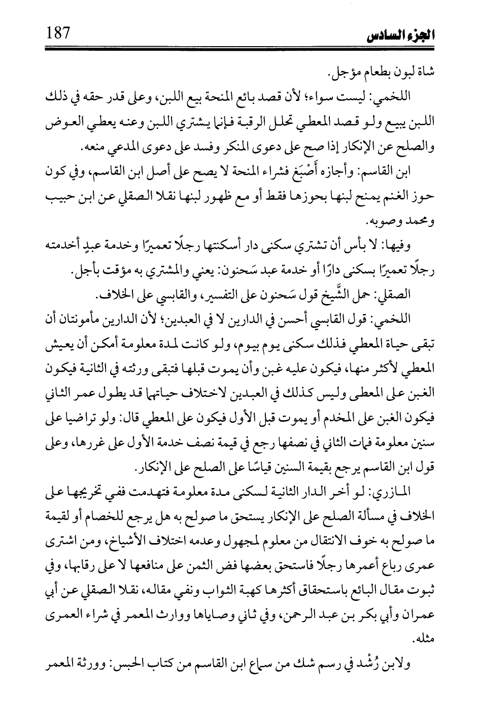 وفيها: لا بأس أن تشتري سكنى دار أسكنتها رجلًا تعميرًا وخدمة عبدٍ أخدمته رجلًا تعميرًا بسكنى دارًا أو خدمة عبد سَحنون: يعني والمشتري به مؤقت بأجل.