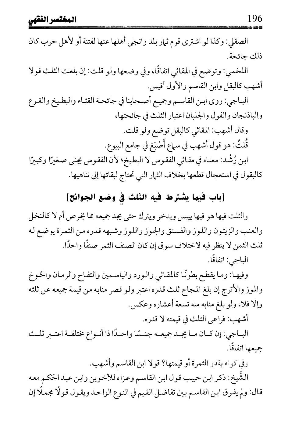 الباجي: روى ابن القاسم وجميع أصحابنا في جائحة القثاء والبطيخ والقرع والباذنجان والفول والجلبان اعتبار الثلث في جائحتها،