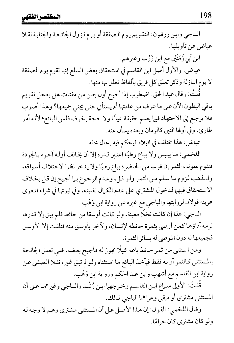 قلت: وقال عبد الحق: اضطرب إذا أجيح أول بطن من مقتات هل يعجل تقويم باقي البطون الآن على ما عرف من عادتها أم يستأني حتى يجني جميعها؟ وهذا أصوب فلا يرجع إلى الاجتهاد فيما يعلم حقيقة عيانًا ولا حجة بخوف فلس البائع؛ لأنه أمر طارئ. وفي أولها التين كالرمان وبعده يسأل عنه.