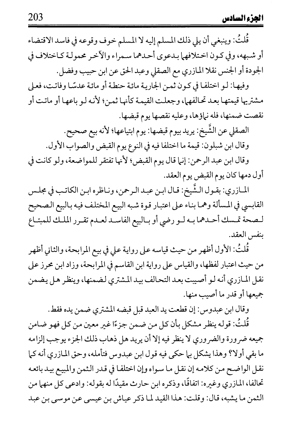قلتُ: الأول أظهر من حيث قياسه على رواية على في بيع المرابحة، والثاني أظهر من حيث اعتبار لفظها، والقياس على رواية ابن القاسم في المرابحة، وزاد ابن محرز على نقل المازري أنه لو أصيبت بعد التحالف بين المشتري لضمنها، وينظر هل يضمن جميعها أو قدر ما أصيب منها.
