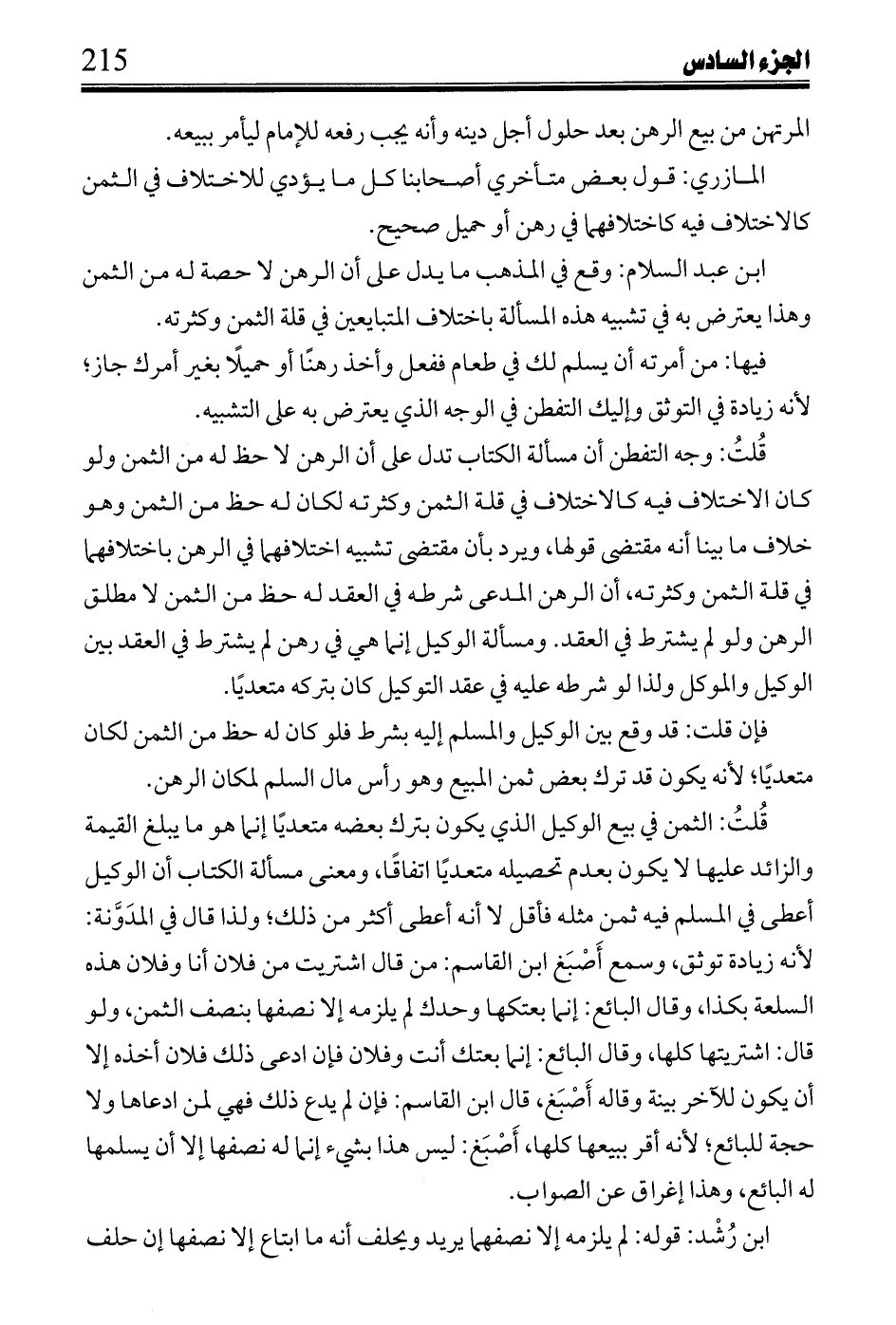 قلت: الثمن في بيع الوكيل الذي يكون بترك بعضه متعدياً إنما هو ما يبلغ القيمة والزائد عليها لا يكون بعدم تحصيله متعدياً اتفاقاً، ومعنى مسألة الكتاب أن الوكيل أعطى في المسلم فيه ثمن مثله فأقل لا أنه أعطى أكثر من ذلك؛ ولذا قال في المدونة: لأنه زيادة توثق، وسمع أصبغ ابن القاسم: من قال اشتريت من فلان أنا وفلان هذه السلعة بكذا، وقال البائع: إنما بعتكها وحدك لم يلزمه إلا نصفها بنصف الثمن، ولو قال: اشتريتها كلها، وقال البائع: إنما بعتك أنت وفلان فإن ادعى ذلك فلان أخذه إلا أن يكون للآخر بينة وقال أصبغ، قال ابن القاسم: فإن لم يدع ذلك فهي لمن ادعاها ولا حجة للبائع؛ لأنه أقر ببيعها كلها، أصبغ: ليس هذا بشيء إنما له نصفها إلا أن يسلمها له البائع، وهذا إغراق عن الصواب.