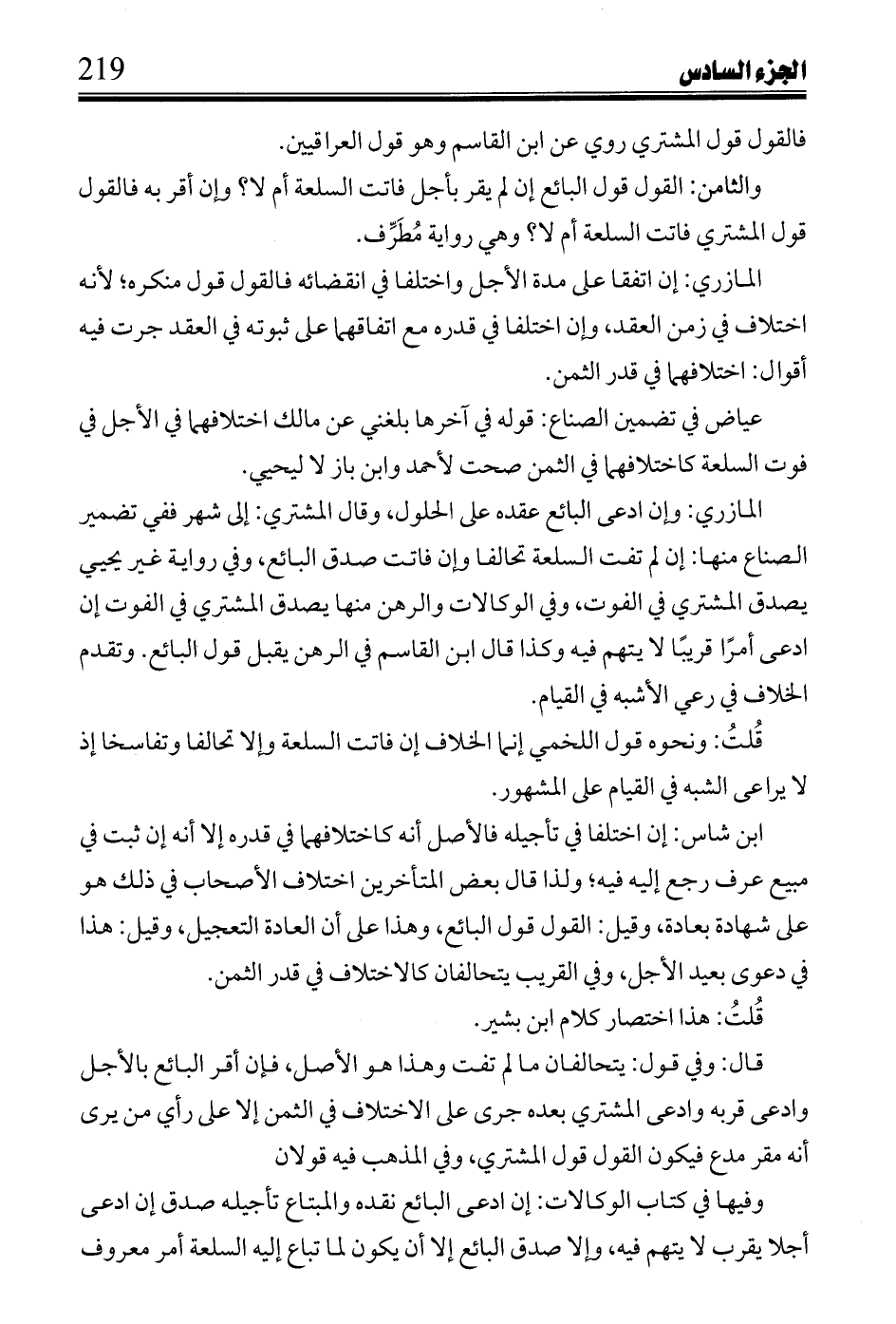 عياض في تضمين الصناع: قوله في آخرها بلغني عن مالك اختلافهما في الأجل في فوت السلعة كاختلافهما في الثمن صحت لأحمد وابن باز لا ليحيى.
