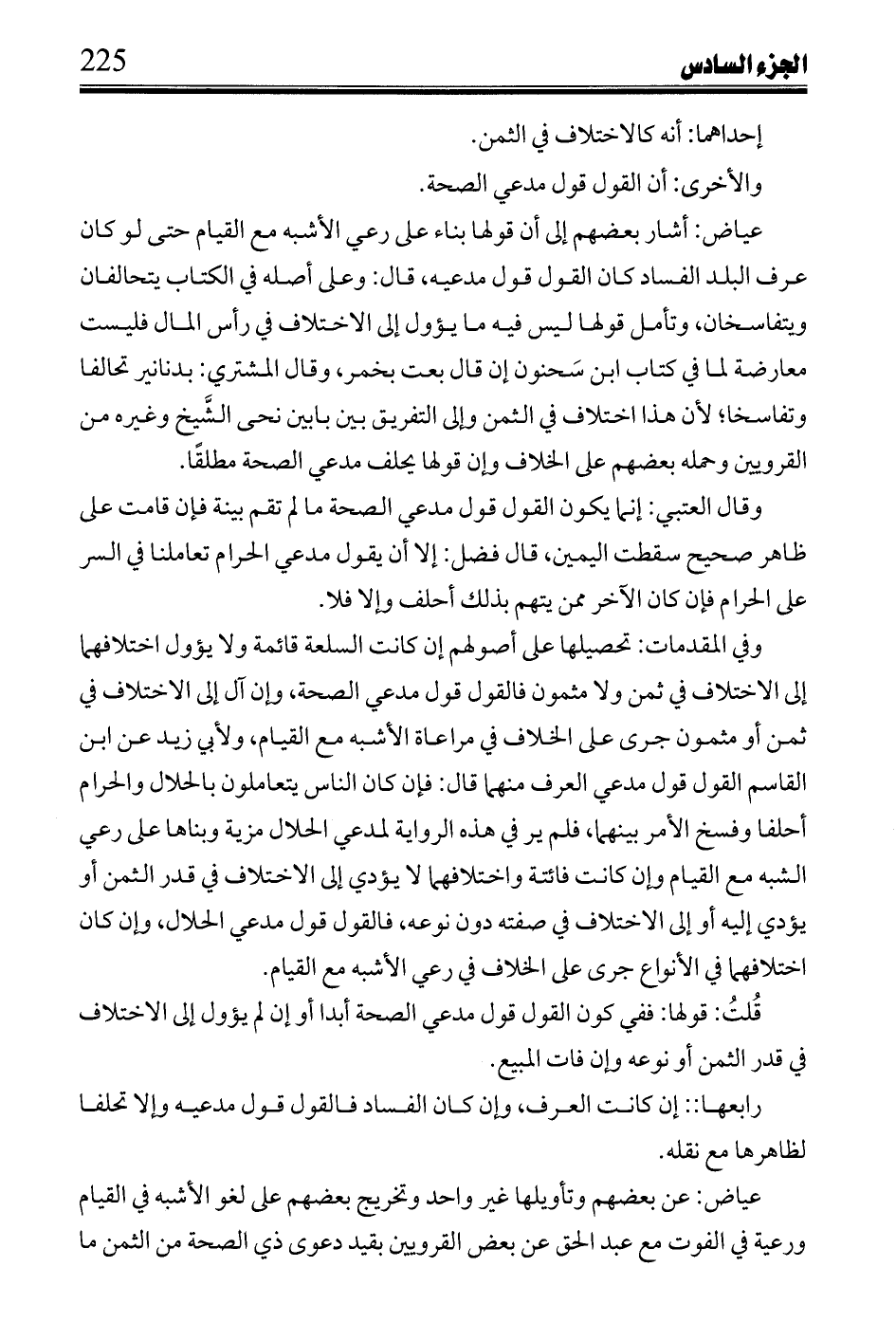 وفي المقدمات: تحصيلها على أصولهم إن كانت السلعة قائمة ولا يؤول اختلافهما إلى الاختلاف في ثمن ولا مثمون فالقول قول مدعي الصحة، وإن آل إلى الاختلاف في ثمن أو مثمون جرى على الخلاف في مراعاة الأشبه مع القيام، ولأبي زيد عن ابن القاسم القول قول مدعي العرف منهما قال: فإن كان الناس يتعاملون بالحلال والحرام أحلفا وفسخ الأمر بينهما، فلم ير في هذه الرواية لمدعي الحلال مزية وبناها على رعي الشبه مع القيام وإن كانت فائتة واختلافهما لا يؤدي إلى الاختلاف في قدر الثمن أو يؤدي إليه أو إلى الاختلاف في صفته دون نوعه، فالقول قول مدعي الحلال، وإن كان اختلافهما في الأنواع جرى على الخلاف في رعي الأشبه مع القيام.