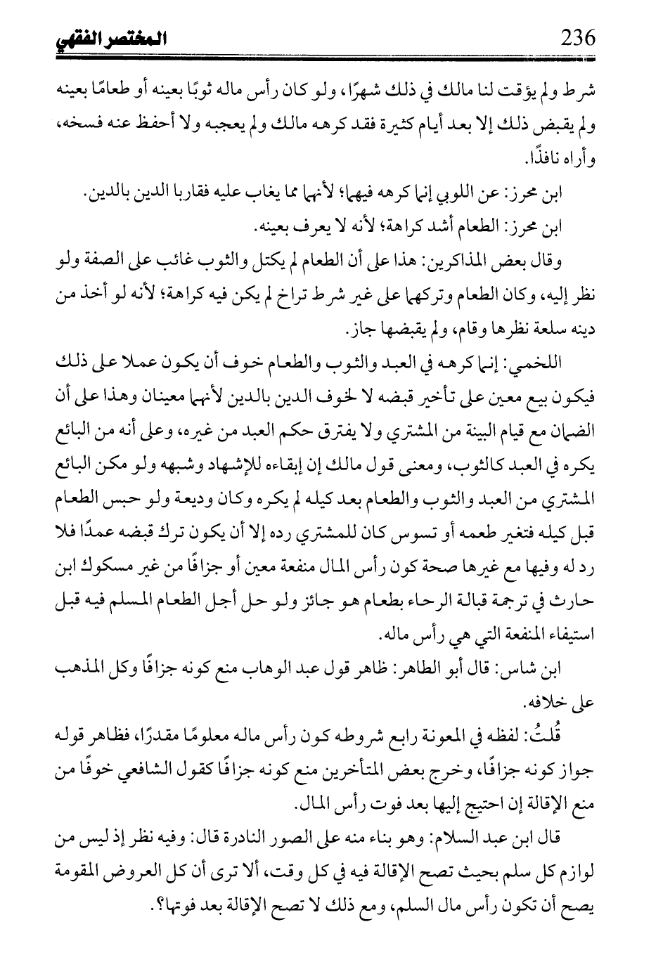 قال ابن عبد السلام: وهو بناء منه على الصور النادرة قال: وفيه نظر إذ ليس من لوازم كل سلم بحيث تصح الإقالة فيه في كل وقت، ألا ترى أن كل العروض المقومة يصح أن تكون رأس مال السلم، ومع ذلك لا تصح الإقالة بعد فوتها؟.